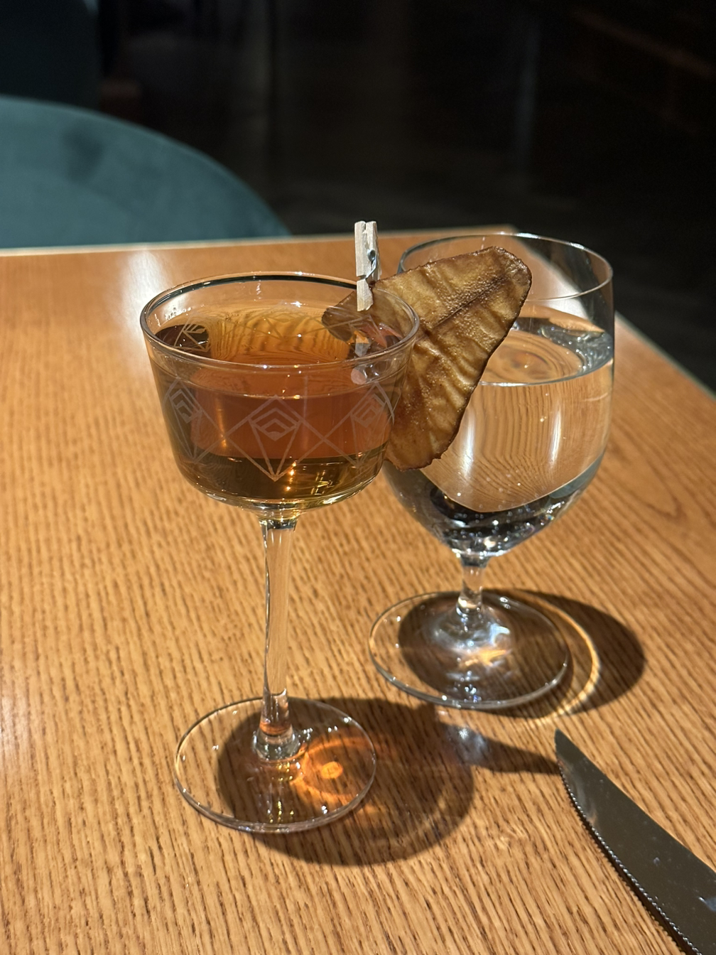 바텐더의 추천을 받아 주문한 첫 번째 칵테일. 헤네시 코냑이 들어갔다. 배 향이 나고, 같이 곁들일 배 칩도 함께 꽂혀있다. 맛은 내가 이제껏 마셔본 칵테일 중 제일 맛있었다. 부드러운 코냑 마시는 느낌. 잔도 예쁘다. 금도 들어있다...