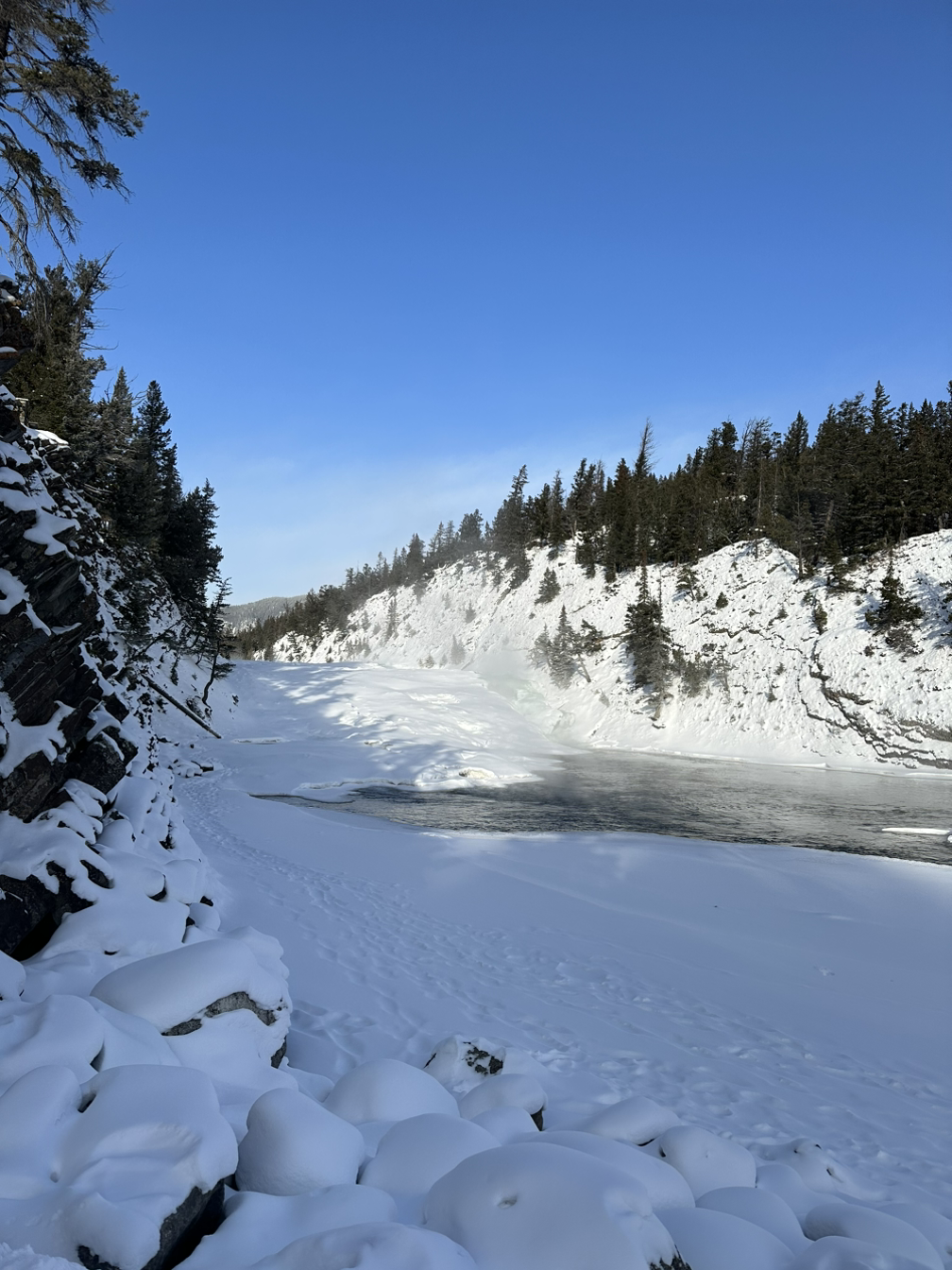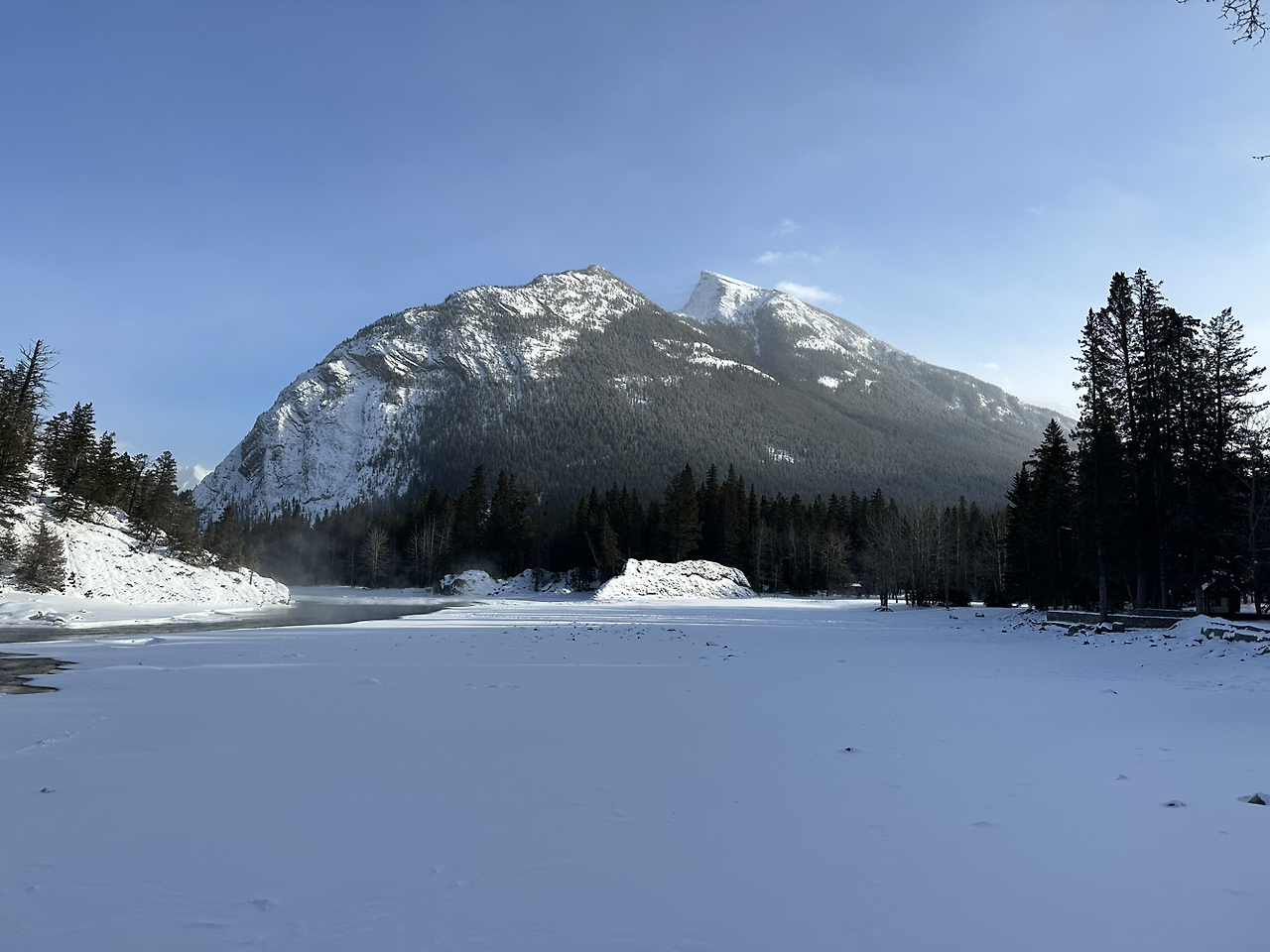 처음 도착한 곳은 보우 폭포. 뜨거운 물이 콸콸 쏟아진다. 겨울 캐나다는 한적해서 어딜 가도 사람이 없거나 두 명 정도가 끝이다. 폭포도 실컷 전세 낸 듯 구경할 수 있었으나 기온이 영하 -30도였다는 점. 걸음을 옮겼다.