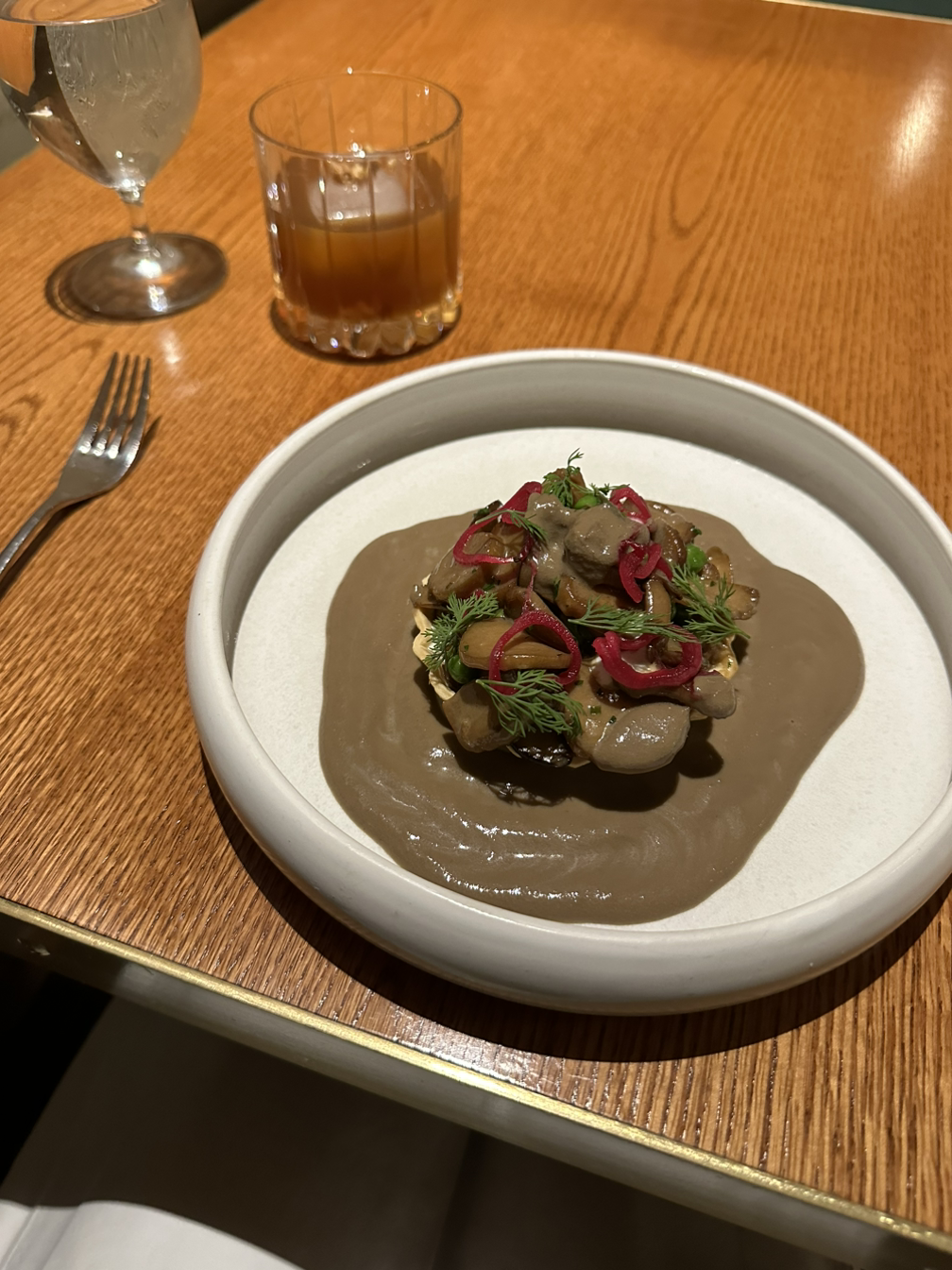칵테일만 먹기 애매해서 안주 겸 작은 푸드를 시켰다. 추천받은 메뉴는 머시룸 타르트. 저 갈색 소스가 엄청 진한 버섯 소스인데 집에서 꼭 만들어보고 싶다. 디저트 메뉴가 너무 달아 보여서 시킨 메뉴였는데 성공적.