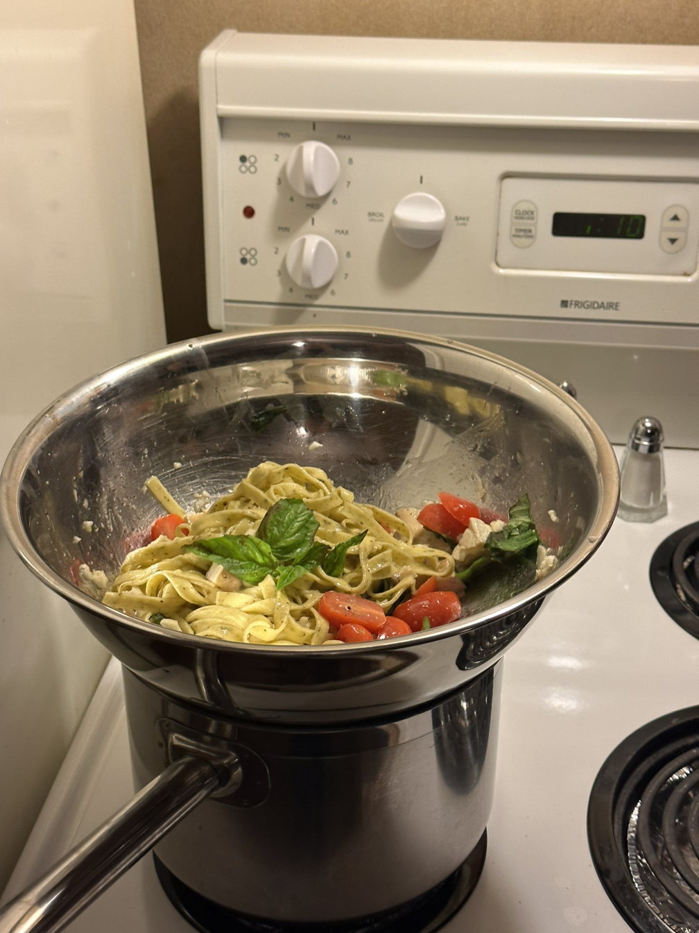 첫날 한 요리. 집에서 할 때는 능숙했는데, 익숙하지 않은 식기로 칼질을 하려니 어색했다. 바질을 힘들게 사 왔는데 밖이 너무 추워서 오는 길에 대부분 얼어버렸다. 그 안에서 나름 괜찮은 녀석들을 골라 데코를 했다.