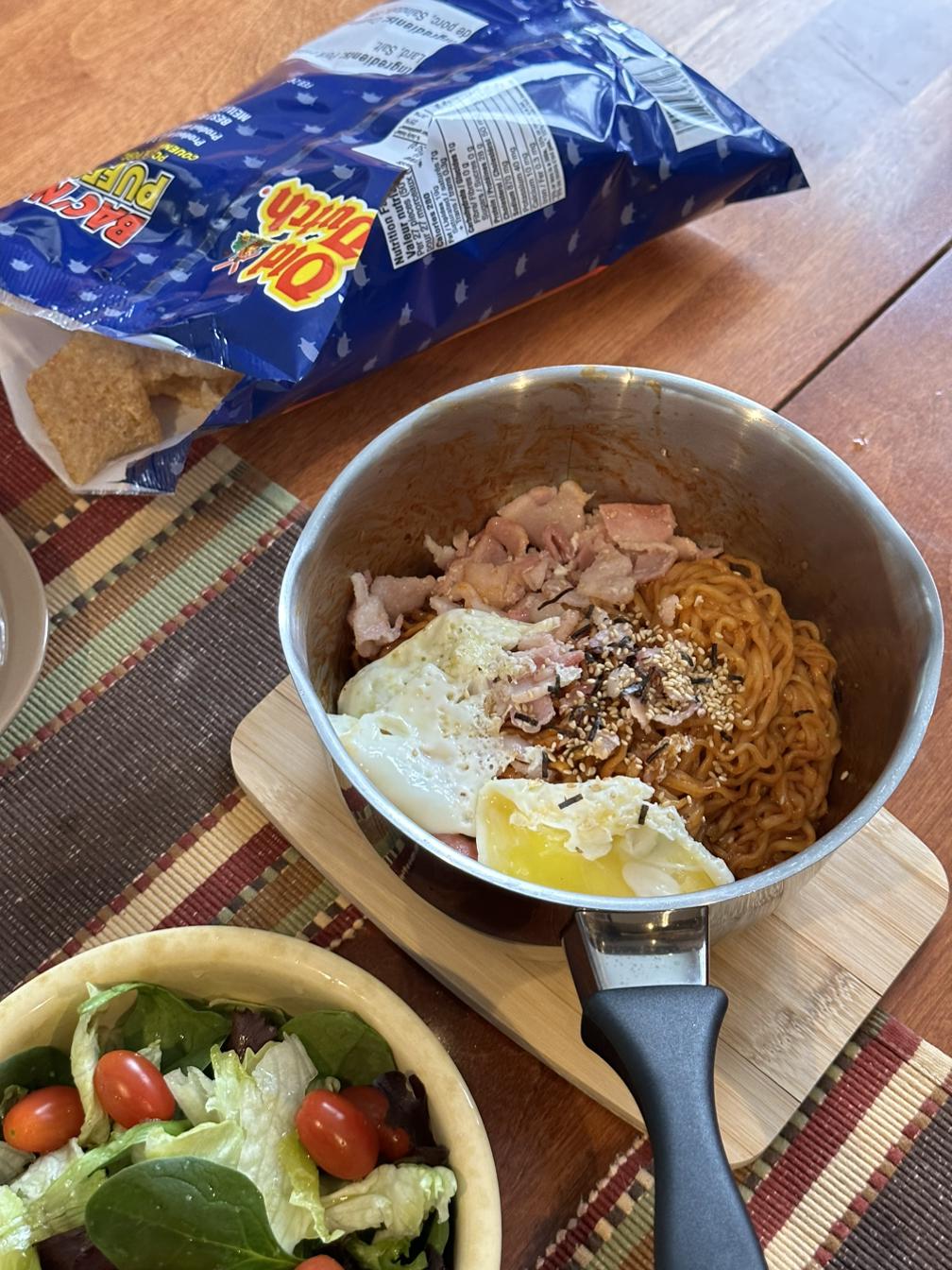오늘의 점심은 베이컨을 넣은 불닭볶음면. 계란을 곁들이니 확실히 덜 매웠다. 수출용이라 그런가? 글을 쓰면서도 입에 침이 나오는군.
