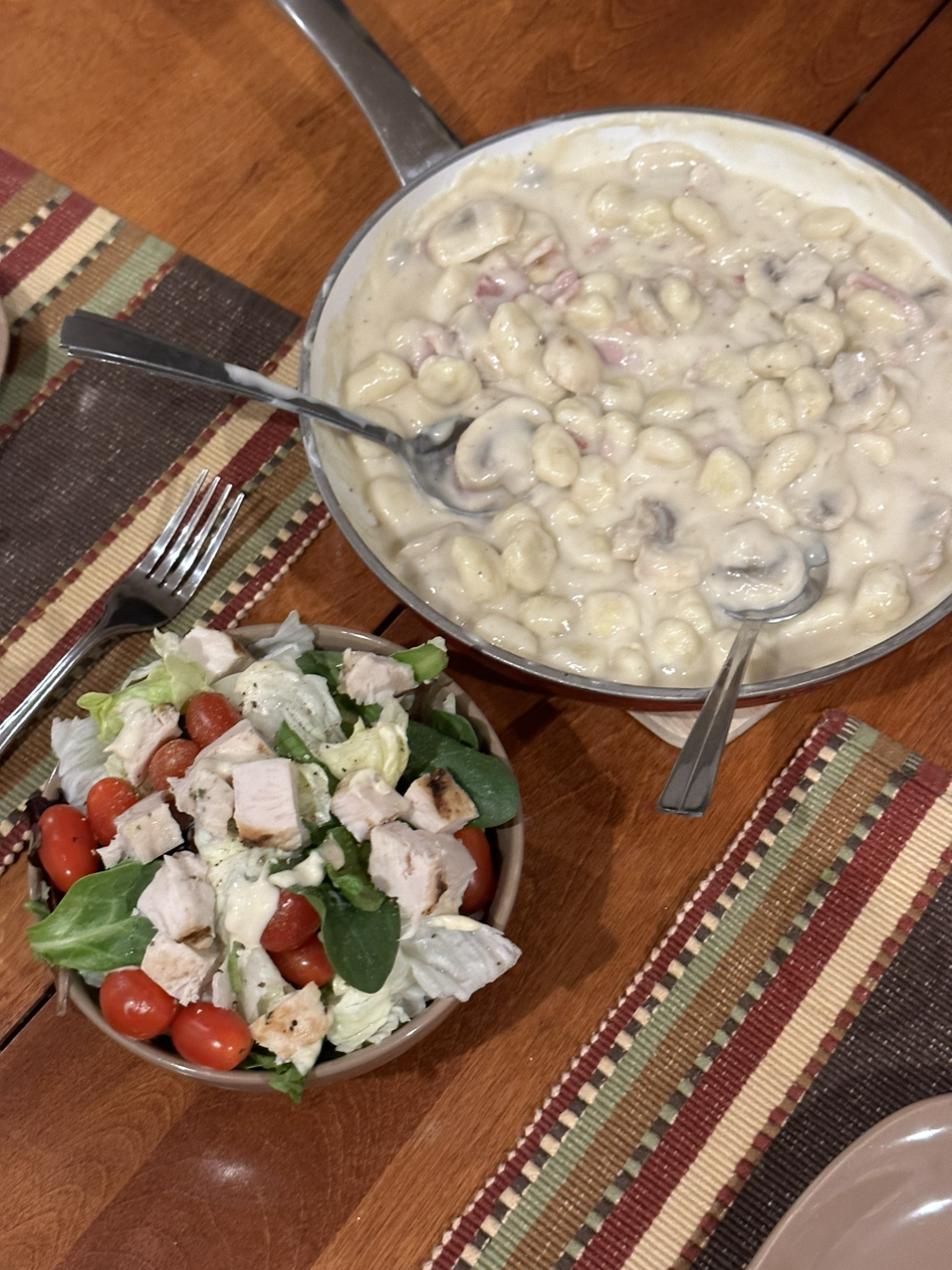 저녁은 과수가 만든 뇨끼. 그리고 내가 만든 닭가슴살 샐러드. 과수는 크림 요리를 잘한다.