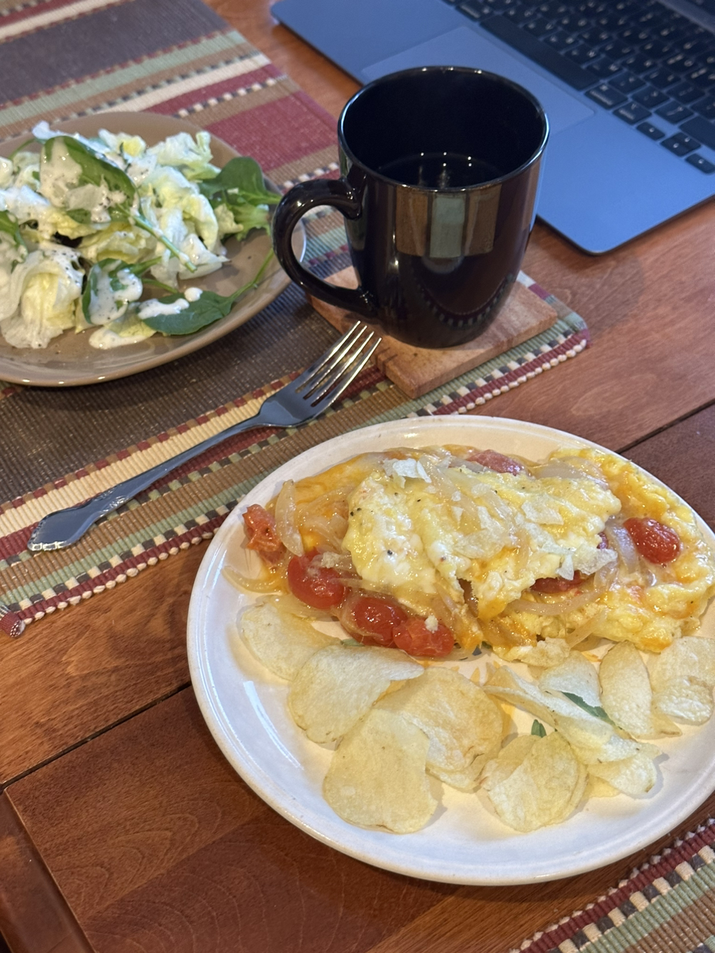 치즈와 토마토, 우유, 양파가 들어간 오믈렛. 맛있었다. 감자칩과 무척 잘 어울리는 맛!