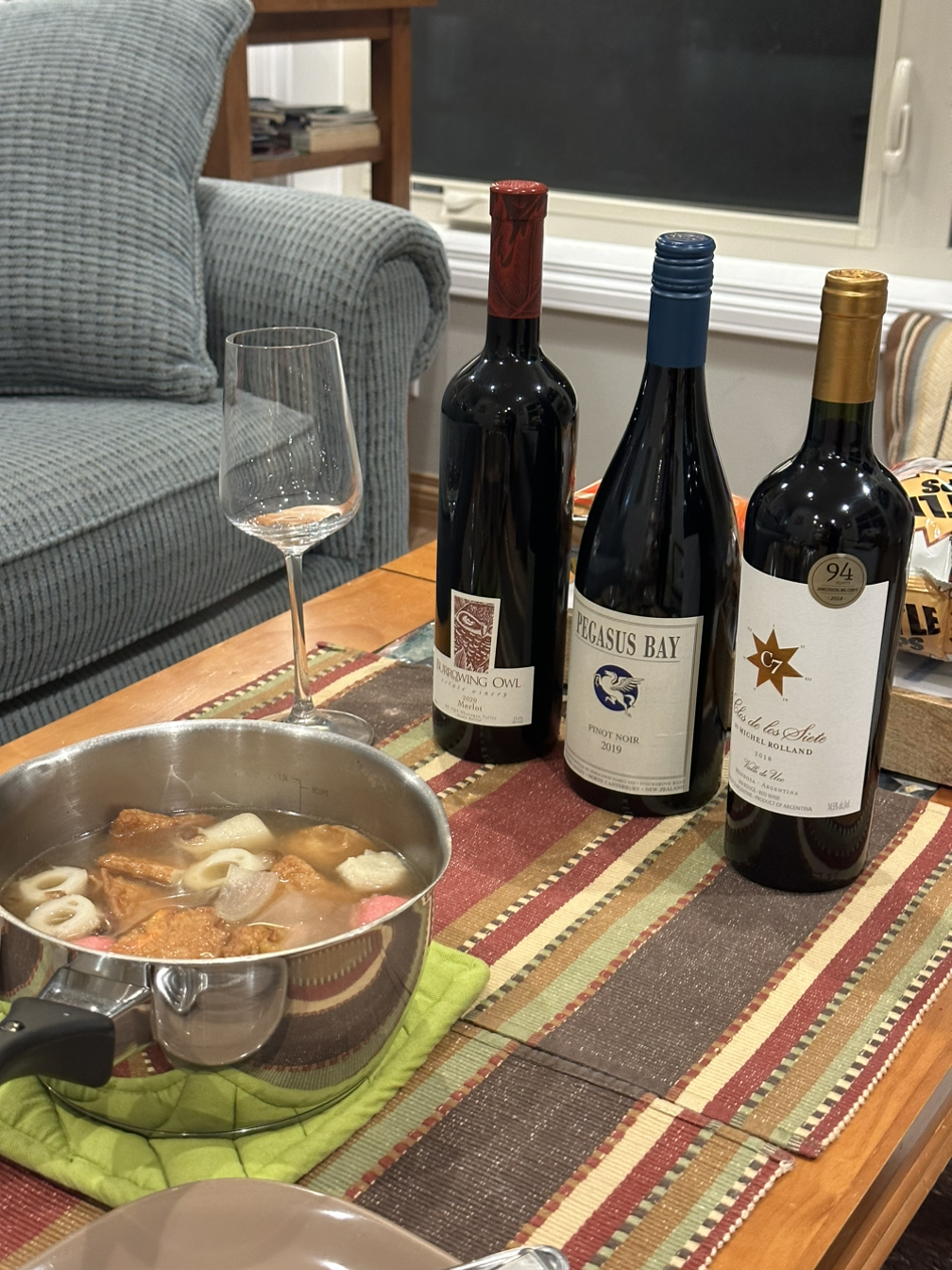 한국 식품 슈퍼에서 사온 오뎅탕과 레드와인 3종. 취해서 마지막 병의 맛은 기억이 잘 안 난다.