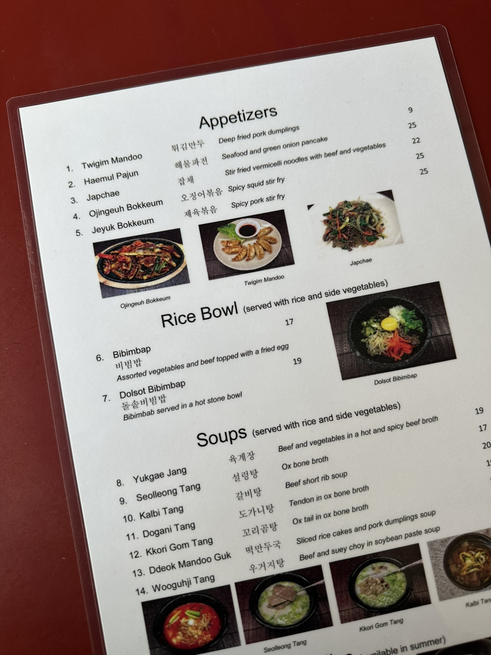 점심은 한식을 먹으러 왔다. 재스퍼에 있는 한식당보다 규모가 큰 느낌이었다. 이름은 서울옥. 며칠 전 가게를 서성이다가 사장님이 친근하게 말을 걸어주셔서 꼭 가보고 싶었다. 여담이지만 오사카에 사는 사람들 중 오오카와상을 굉장히 닮으셨음.