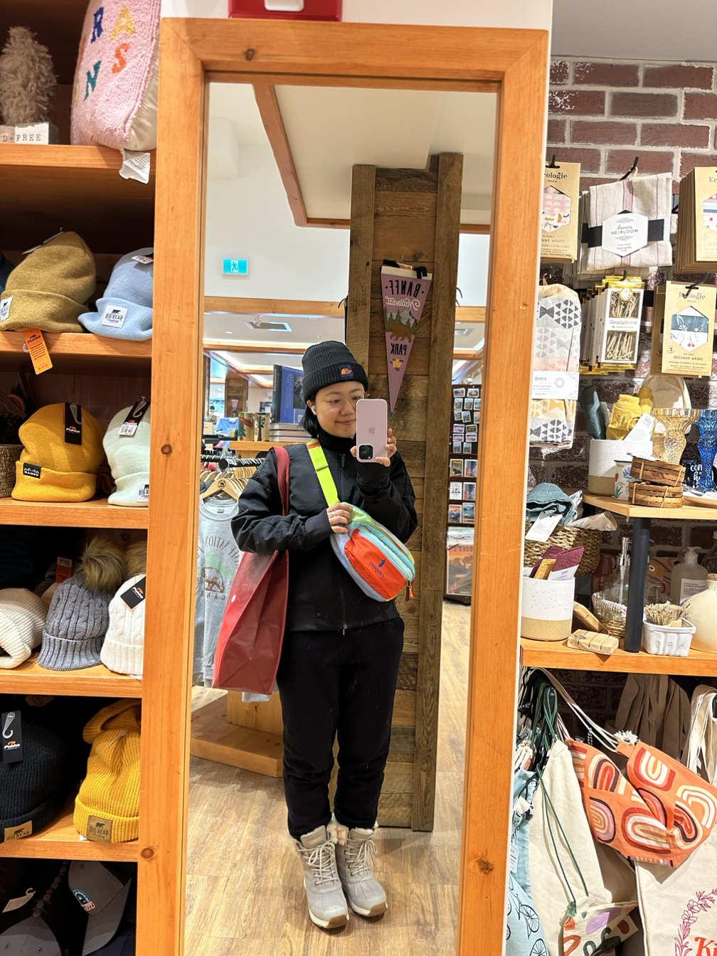 나의 착장. 재킷을 룰루레몬에서 세일로 10만 원에 구매했는데 원래부터 내 옷 같은 느낌이다. 온통 검은 옷인데 컬러 포인트가 중간중간 있어서 좋다.