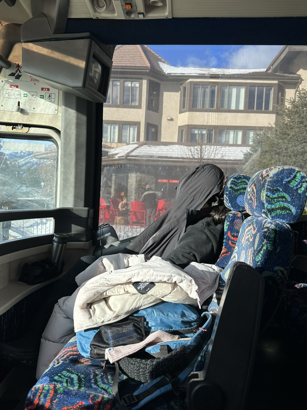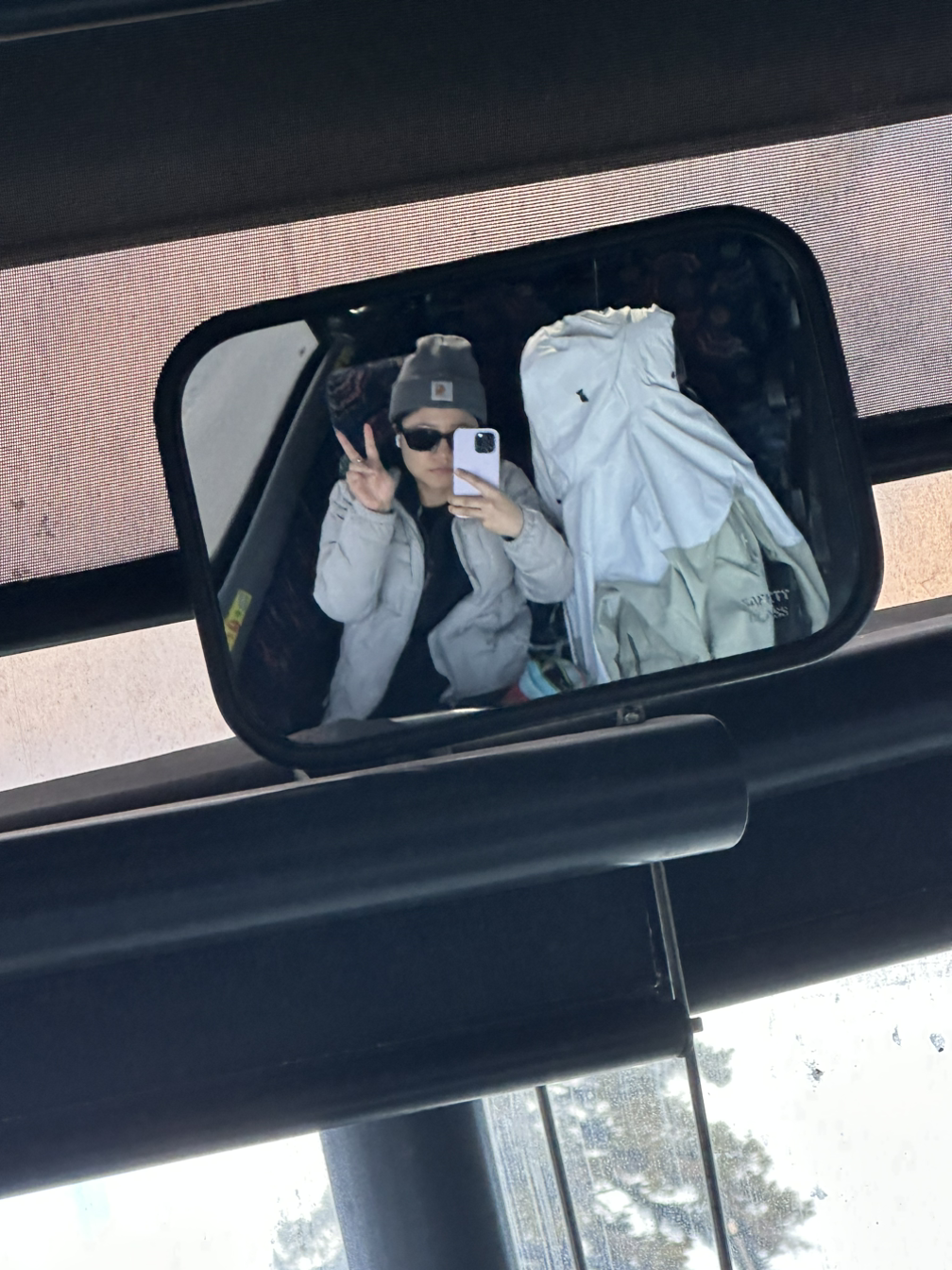 이런 사진 본인은 싫어하지만 나는 웃기고 귀여워서 좋아함... 떠나는 날의 밴프는 크리스마스처럼 화창했다. 우리는 둘 다 맨 앞자리에 앉아서 간다.
