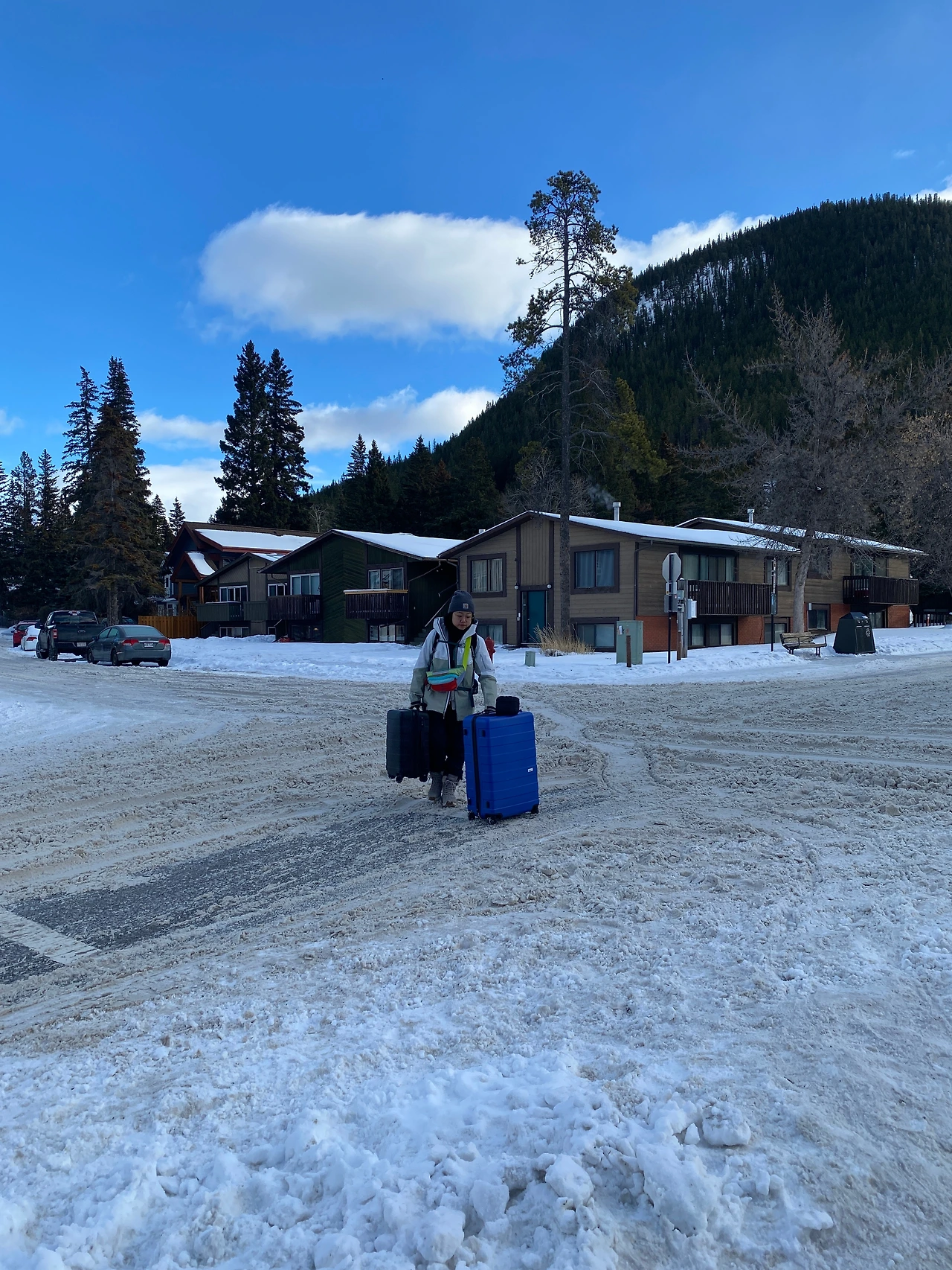 눈 지옥길의 서막. 숙소를 떠나는데 눈이 흙과 섞인 밀크티존이 우리를 괴롭게 했다. 밴프 제설은 다운타운 메인 도로에만 되어있다. 진심 게임으로 치면 스턴 걸린 것 같은 상태다. 발에 껌 붙은 것처럼 무거운 걸음. 이것이 캘거리에서 더한 지옥길로 펼쳐질 거란 생각을 꿈에도 하지 못한 채... 짐 싣는 곳으로 향했다.