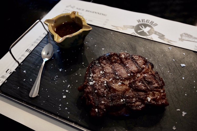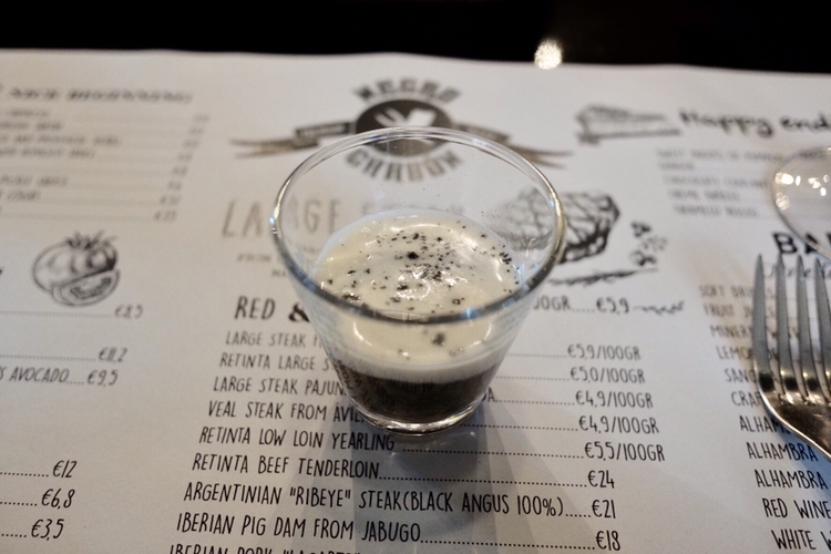 지금은 스테이크 가게에 와있다. 가볍게 샌드위치를 먹을까? 했으나 아니야. 오늘은 고생했으니 무겁게 스테이크다. 와인 한 잔이 저렴하고 맛있다. 조금 먹었을 뿐인데 나른한 기분이 든다. 이 가게는 예약이 전부 꽉 차 있어서 그냥 오픈 시간에 맞춰서 왔다. 훌륭한 선택이었어. 술을 시키면 안주같이 작은 음식을 준다. 보기엔 차가워 보였으니 컵을 쥐니 따뜻하다. 감자 수프 같은 맛이네. 깔끔하고 좋다. 본 메뉴가 기대된다.