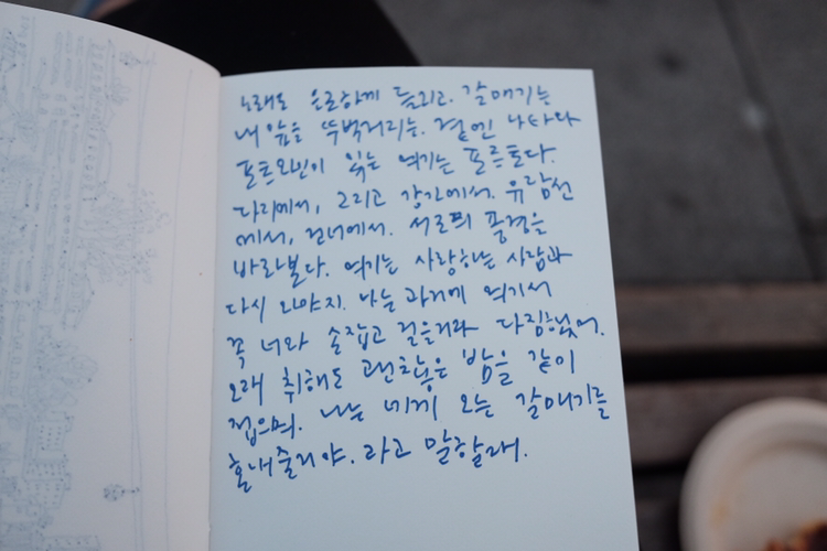 실수로 산 5유로짜리 와인이 포트와인이었다니, 잘한 실수다. 하늘은 짙은 남색과 우주 색의 사이에 있다. 나는 맨발로 벤치에 앉아 와인을 마시고, 그림을 그리고, 일기를 썼다. 듣게 되는 옆자리 한국어가 싫어 이어폰을 꼈다. 나는 무슨 글을 쓰고 있는 걸까? 나를 위한 글? 보여주기 위한 글? 나를 위해 쓰는 보여주는 글? 모르겠다. 이따금 공기에 섞인 담배냄새를 맡는다. 냄새라는 건 고를 수 없으니까. 내게 주어진 소리와 냄새와 빛을 고스란히 받으며. 감내할 수 있는 무력감을 느낀다.