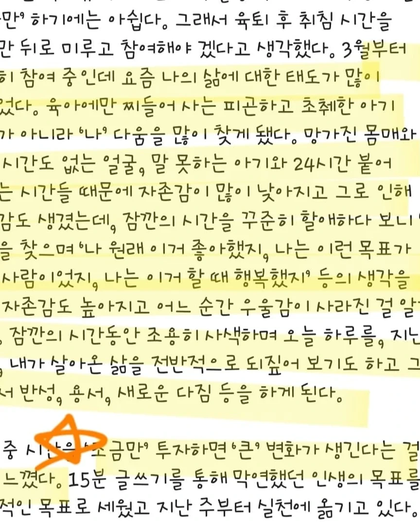 <왜 주제 글쓰기를 하나요?> 매일 글을 쓴다는 것은 일기와 비슷하죠. 일기는 오늘 있었던 일들에만 집중하지만 '주제' 글쓰기를 하게 될 경우는 그 주제에 대한 스스로의 생각을 쓰기에 저의 관점이 '과거'로 갈 수도 '미래'를 향해 갈 수도 '현재'를 쓸 수도 있게 됩니다. '과거'를 쓸 경우에는 그 사건이나 물건 등에 저만의 견해나 의미 부여가 되고 '미래'에 대해 쓸 경우는 무의식에 담겨있는 저의 목표나 되고 싶은 이상을 깨닫게 돼요. 그게 현재의 고민을 담고 있기도 합니다. '현재'에 대해 쓰게 될 경우 오늘의 의미나 현재의 자신의 상태, 내가 바라보지 못했던 나의 마음이 담겨서 글이 써지기도 해요. 나라는 사람은 현재의 '나'만 있는 것이 아니라 '과거의 나' + '현재의 나' + '미래의 나'로 만들어져 있는 존재이기 때문이죠.