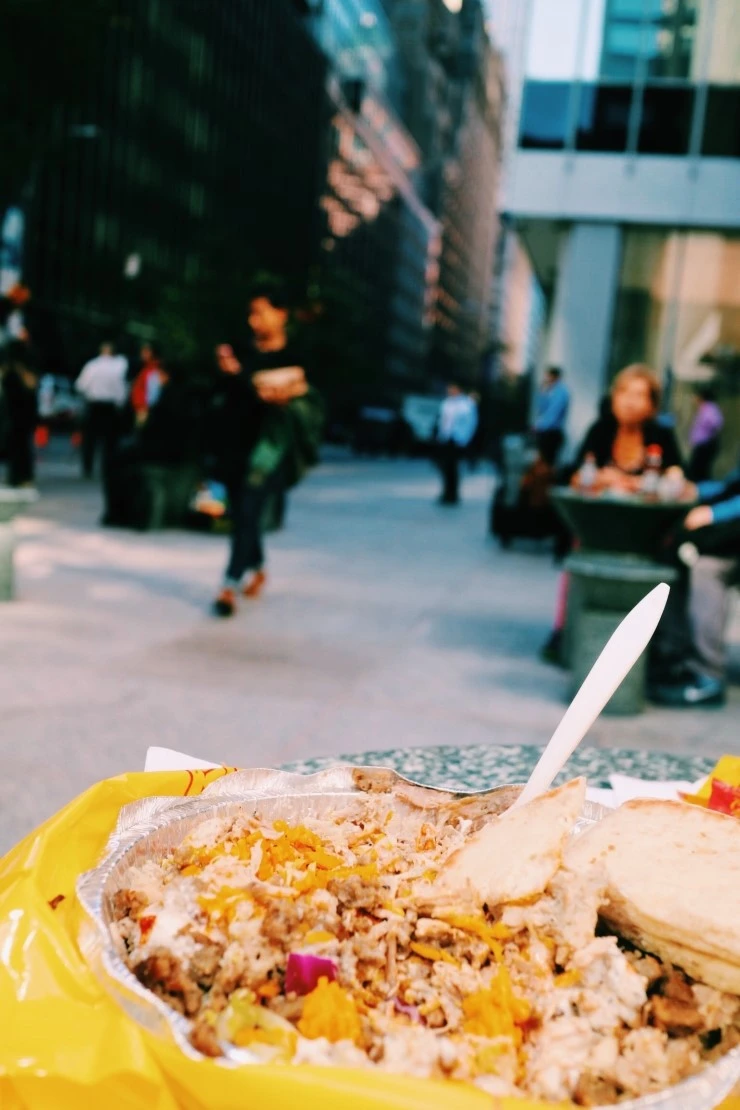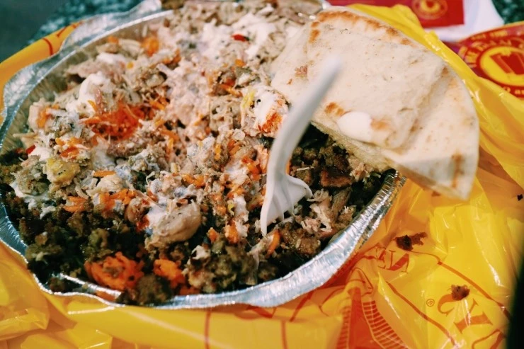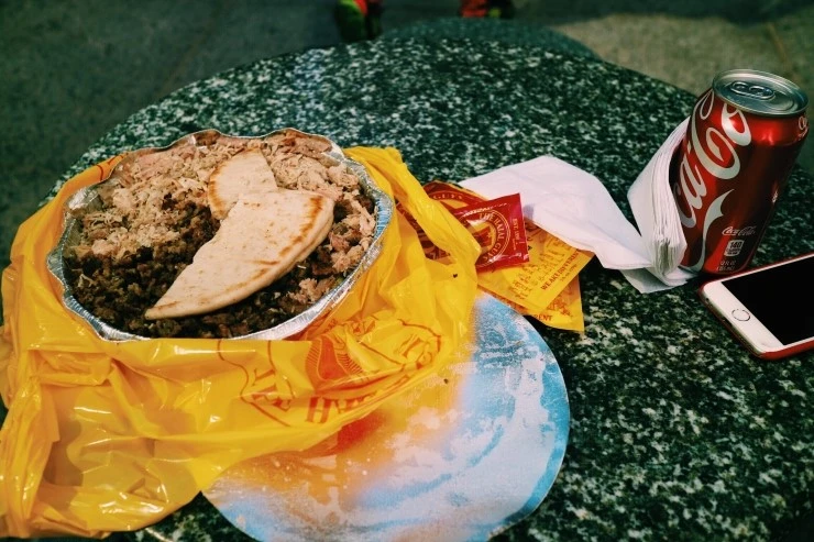 꼭꼭 먹어보라던 대망의 할랄 가이즈에 줄을 섰다. 엄청나게 긴 줄이 늘어서있는데 줄어드는 속도가 LTE급. 양고기를 워낙 좋아하니 양고기+닭고기 캄보를 시켰고 콜라도 하나 샀다. 처음 받아 들고 펴보았을 때는 양이 어마어마하게 많았다. 소스도 이걸 다 먹을 수 있을까 싶어서 조금씩만 뿌리며 먹어보려고 했다.
