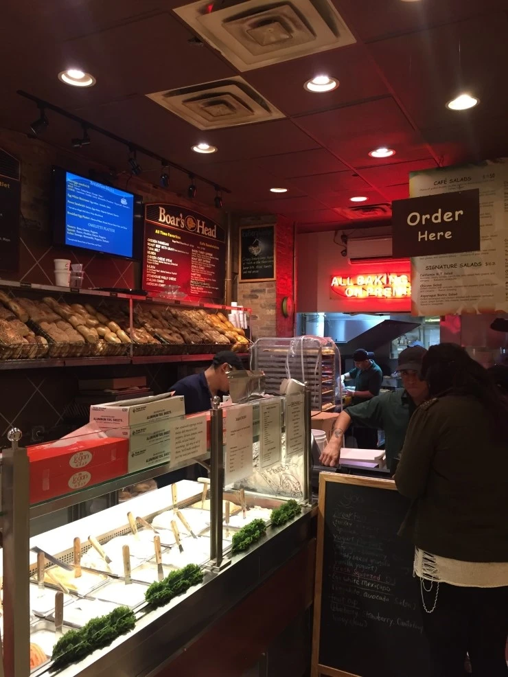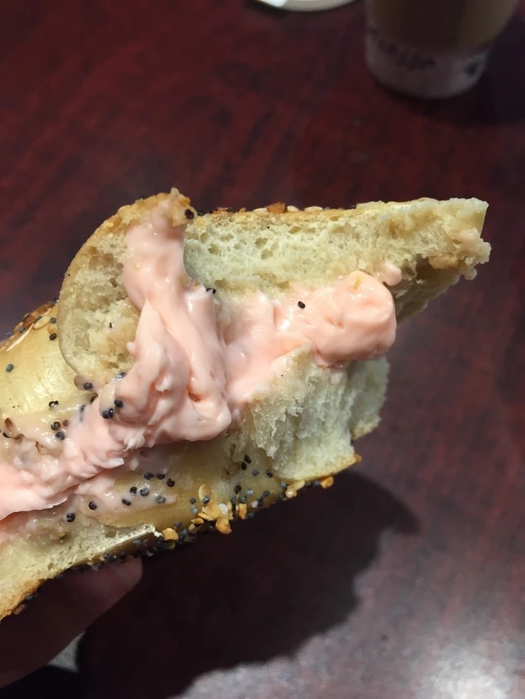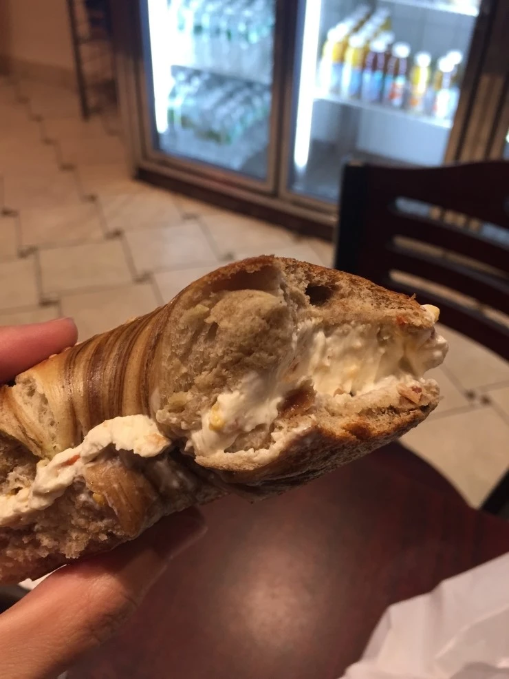 진짜 너무나 미국적인 분위기였다. 요즘의 카페베네처럼(아놔 며칠 전에 갔다가 깜짝 놀랐네) 다양한 종류의 베이글이 벽돌처럼 쌓여있었고 약 스무 개 정도의 크림치즈를 고를 수 있었다. 아무것도 모르겠어서 만만하게 베이컨/체다치즈 크림치즈와 통곡물 베이글을 고르고 스트로베리 크림치즈와 시나몬 베이글을 골랐다. 사실 처음 것만 고르고 두 번째 것은 무엇을 골라야 할지 모르겠어서 sweet 한 것으로 하나 추천해달라고 했다. 그런데... 내가 말을 잘못한 건지 아니면 그들이 잘못 알아들은 건지 반대의 조합이 나왔다. 가격은 잘 기억이 안 난다. 비싸지는 않은 가격이었다. 커피 한잔도 시켰다. 블랙커피였다.
