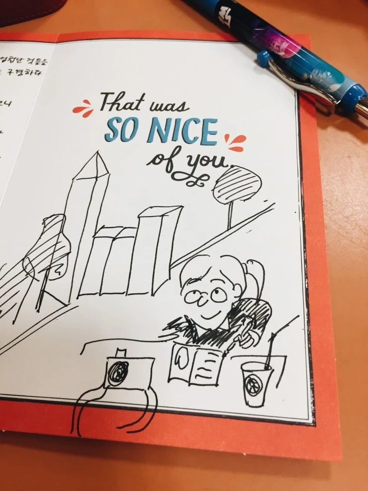 한국에 돌아가서 편지를 전달할 수신자는 비행기표 시원하게 긁어주신 엄마와 아빠... 펜이 없어 기념품 급으로 할인 중인 스타워즈 한정판 볼펜도 사고(정작 스타워즈 한편도 안 봤음) 한쪽에는 카드를 쓰고 한쪽에는 나름 카드 쓰고 있는 나를 그렸다.