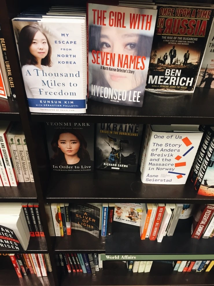 그러나 무엇보다 가장 인상적이었던 것은, social issue 또는 political issue 면을 채우고 있던 책. 지나가다 언뜻 보고 '오 한국사람처럼 생겼다'라고 생각했는데 한국 사람이었다. 탈북자 여성들의 수기였다. 학부생 때 북한학 수업을 들으며 나도 꽤 자주 들춰보곤 했었는데 탈출 과정을 상세히 적어 내려 가는 이런 식의 책은 우리나라보다 외국에서 보다 더 뜨거운 반응을 얻는 듯하다. 학부 막 학기 쯔음 내가 읽은 책 역시 한 탈북자 여성이 북한에서 지내온 이야기, 힘겹게 탈출한 후 우리나라에서 적응하는 이야기 등이 적힌 영어서적이었다. 외국인 교환학생들이 많은 수업이었는데 꽤 심도 깊은 이야기가 오갔던 것으로 기억한다.