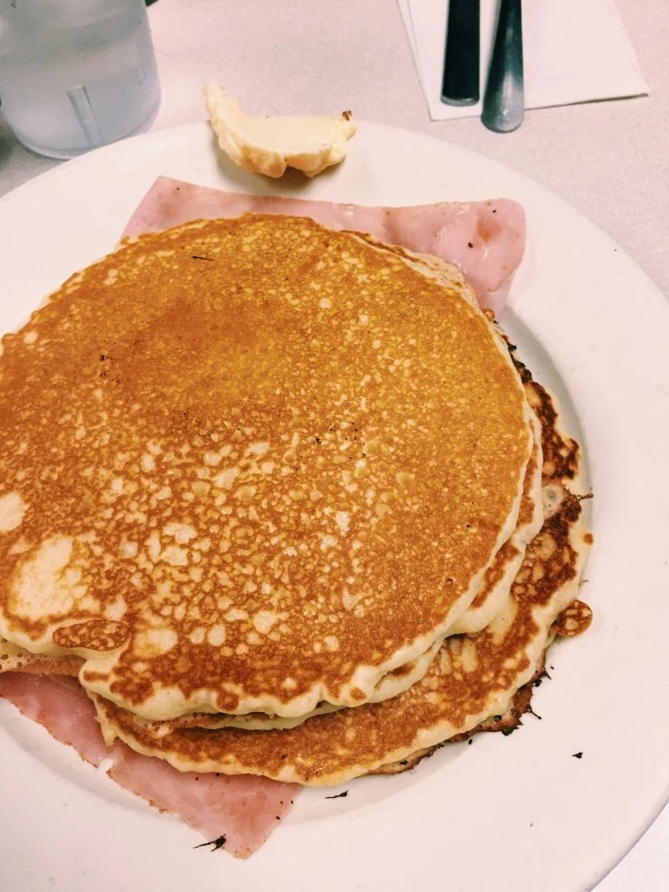 금세 얼굴만 한 핫케잌 세 장이 놓였다. 얇은 햄은 달랑 두어 장뿐이었다. 보자마자 크게 실망했다. 옆 사람이 먹고 있었던 것은 기본 핫케이크가 아니라 이것저것 위에 추가한 것인 모양이었다. 이걸 다 먹을 수 있을까, 목이 메이지 않을까, 다른 걸 좀 더 시킬까 싶었지만 이 어마어마한 양도 해치우지 못할 것 같았다. 무엇보다 머리도 감지 않고 나왔기 때문에 빨리 숙소로 돌아가고 싶었다. 접시 끄트머리에 대충 발라진 버터를 이 밀가루떡 위에 얹고 역시나 성의 없이 건네진 시럽을 뿌렸다.