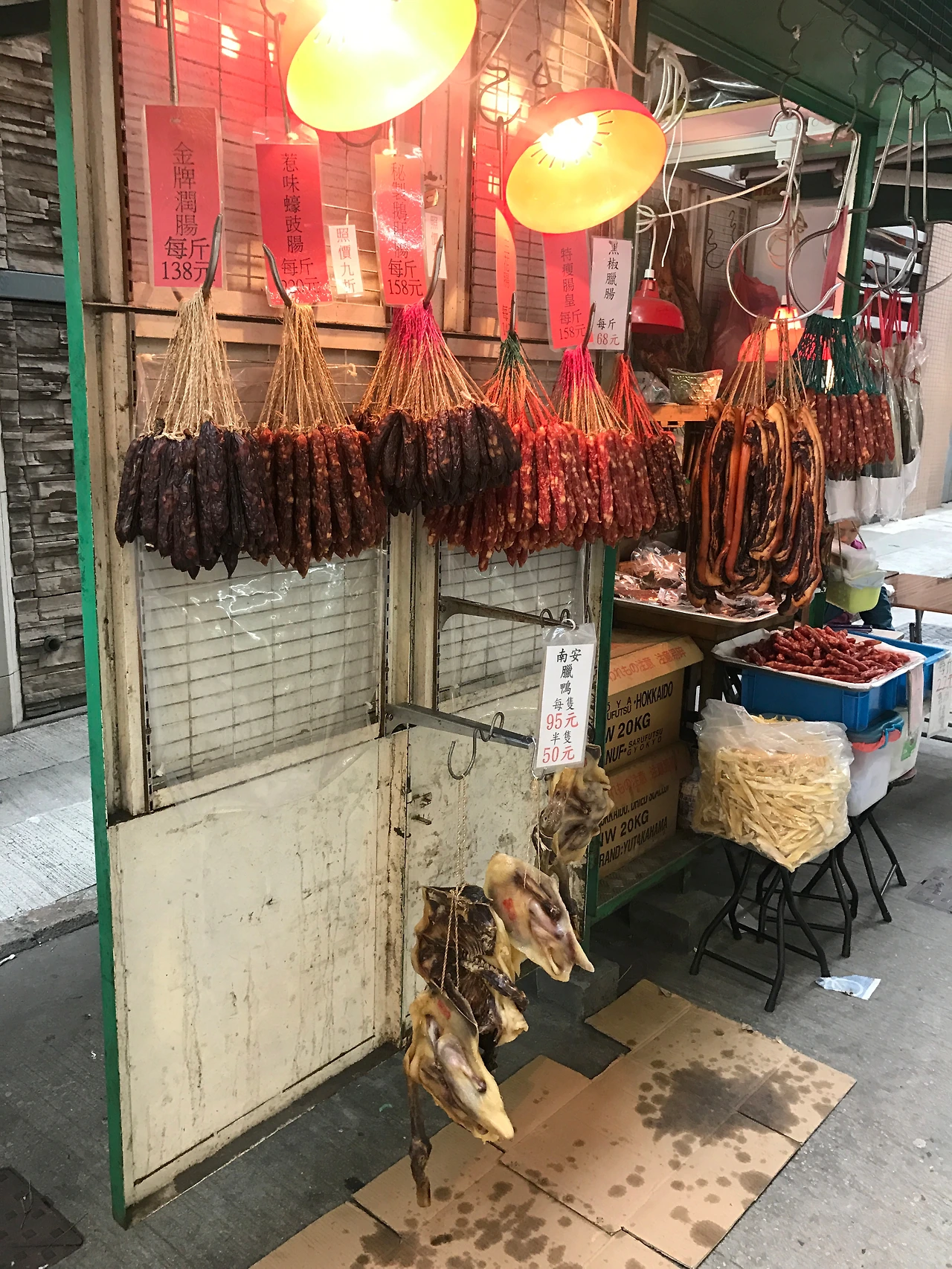 알 수도 없고 알고 싶지도 않은 것들이 길거리에 주렁주렁. 나중에 플리토를 이용해 번역해보니 거위 간, 오리 내장 등의, 나름 소세지(?) 음식이었다.