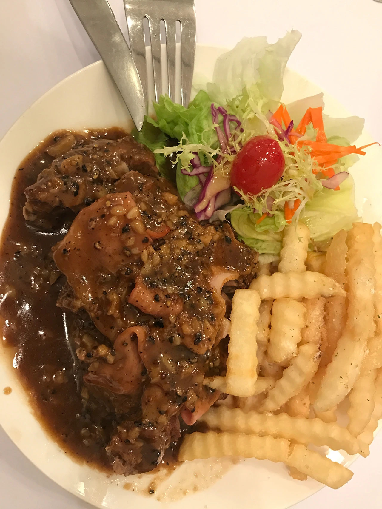 후추가 가득 들어간 이 스테이크와 감자튀김은... 롯데월드 아니면 에버랜드에서 많이 먹어봤음직한 그런 맛. 로티로리 머리띠 한 친구들이 서빙해줄 것 같은 그런 맛...