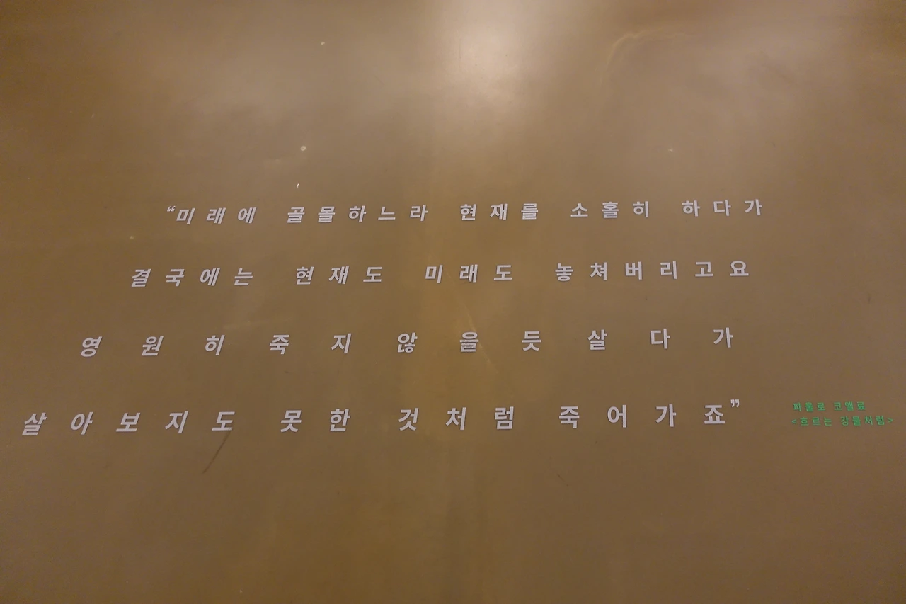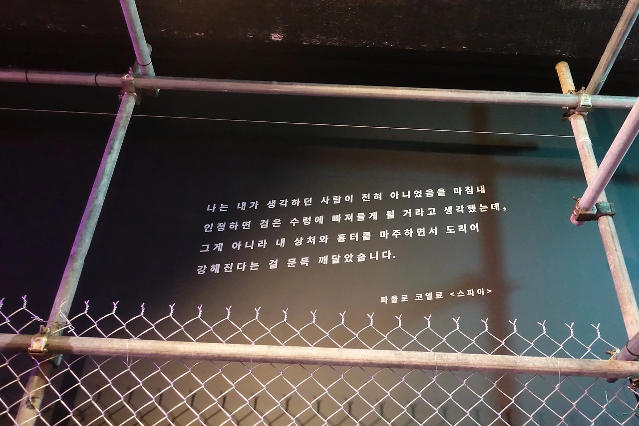 군데군데 파울로 코엘료의 구절을 인용한 것을 보면 이 전시의 큐레이터는 다각적인 시각으로 청춘을 보고 느끼고 열망해보고 다시 돌아 갈 수 있는 순간의 기분을 느껴보고, 현재의 청춘들과 같은 공간에서 호흡하라는 메시지를 던지고 있는지도 모른다.