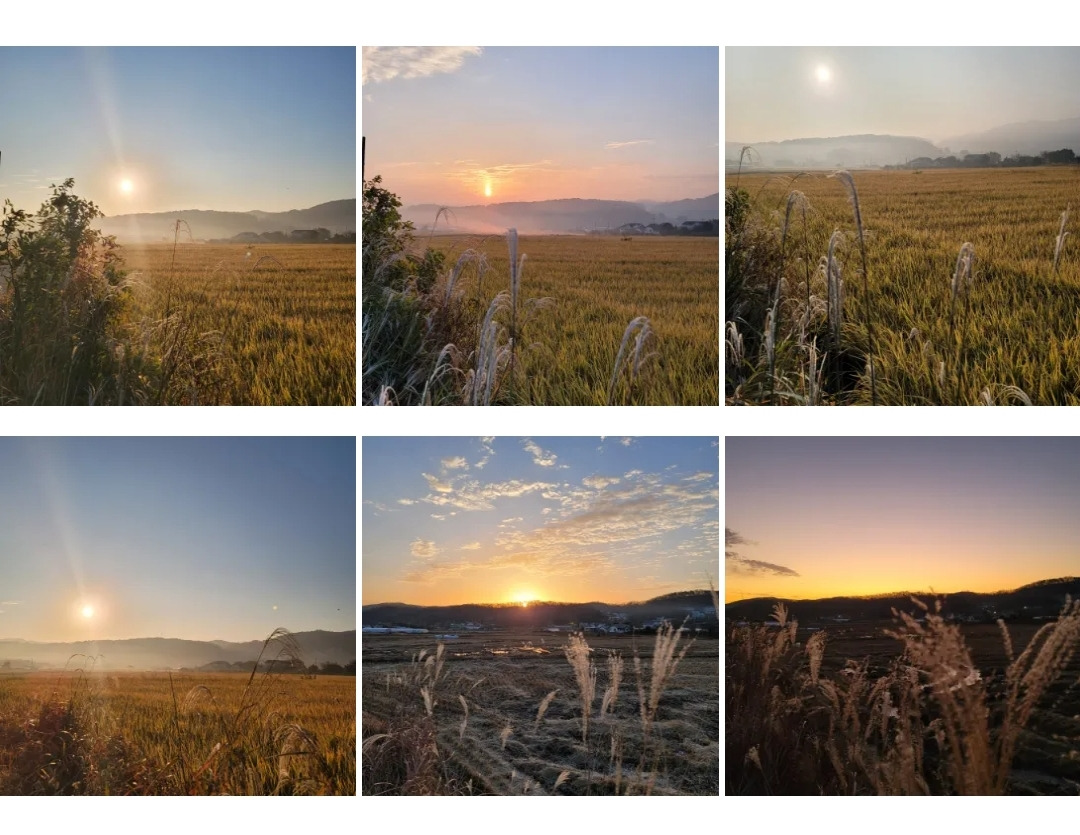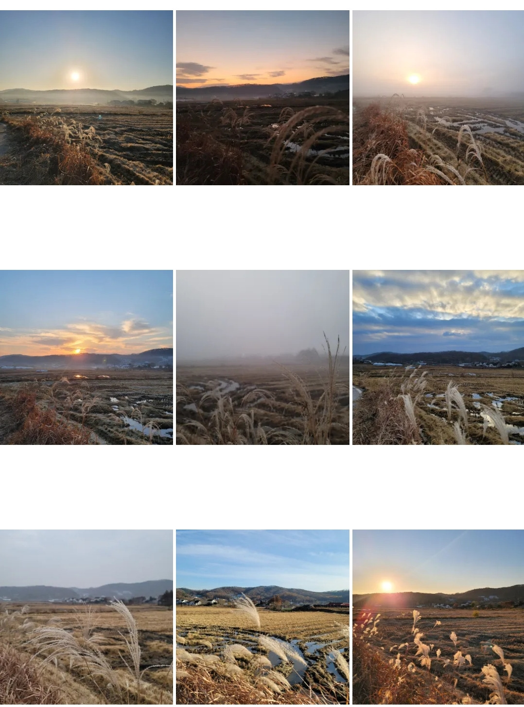 깨끗한 구름 한 점 없는 하늘에 붉은 해를 만나고, 일출인지 일몰인지 구분 안될 정도로 멋진 하늘색, 잔뜩 낀 안개 뒤로 흐릿한 해도 만난다. 하늘에 구름이 높게 낀 날, 햇빛에 갈대가 반짝이던 모습까지 하루하루 매일 다른 모습을 담으며 걷는다.