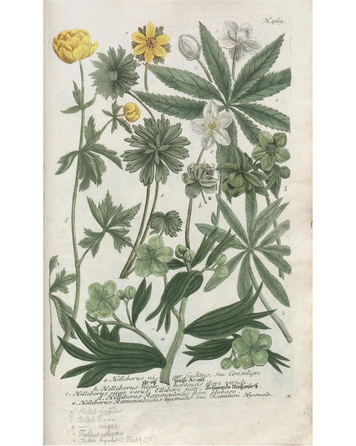 헬레보루스는 미나리아재비과(Ranunculaceae) 식물이다. 라넌큘러스, 아네모네, 담장을 타고 오르는 클레마티스가 같은 식구다. 미나리아재비과 식물의 특징 중 하나는, 꽃잎이라고 생각하는 부분이 사실은 꽃받침인 경우가 많다는 점이다.