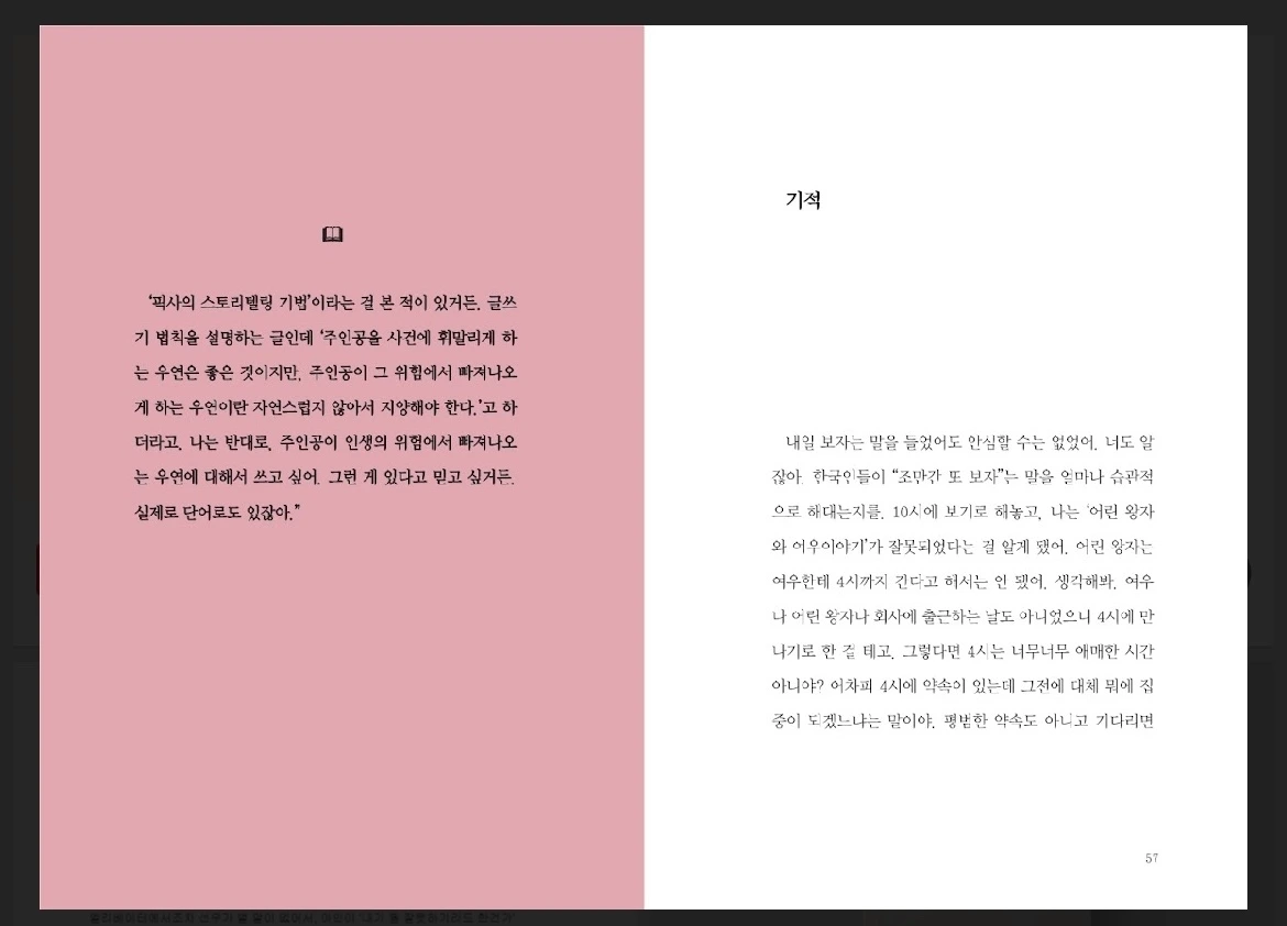 ‘픽사의 스토리텔링 기법’이라는 걸 본 적이 있거든. 글쓰기 법칙을 설명하는 글인데 ‘주인공을 사건에 휘말리게 하는 우연은 좋은 것이지만, 주인공이 그 위험에서 빠져나오게 하는 우연이란 자연스럽지 않아서 지양해야 한다.’고 하더라고. 나는 반대로, 주인공이 인생의 위험에서 빠져나오는 우연에 대해서 쓰고 싶어. 그런게 있다고 믿고 싶거든. 실제로 단어로도 있잖아. 기적.