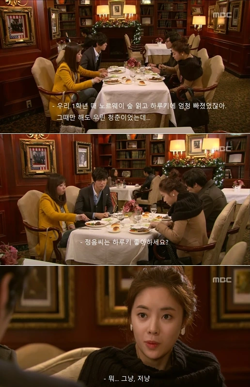 서울대 출신 남친의 친구 커플과 식사 자리에서 하루키와 앤디 워홀을 몰라 자존심이 상하는 서운대 출신 황정음의 에피소드이다. 저 때만 해도 하루키를 들어보기만 했지 소설을 읽어본 적이 없던 터라 '아니, 하루키를 모르면 무식한 거야?' 하며 읽어보지도 않은 책에 대한 반감을 드러냈다.