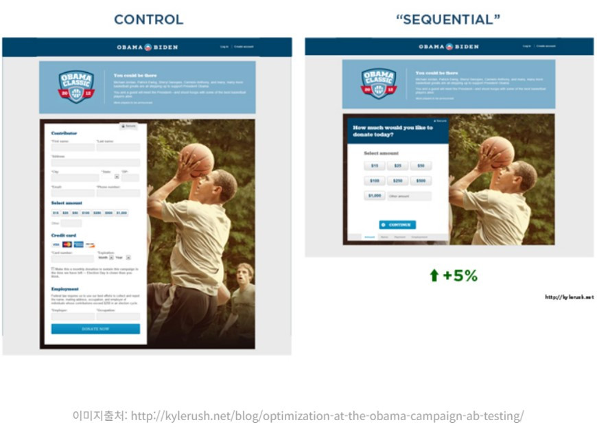 오바마의 대선 홍보 활동 당시, 더 많은 기부금을 이끌어낸 방안을 마련했던 유명한 ABTEST 사례가 있어요. A안은 여러 항목을 요구하는 프로세스로, B안은 요구 항목을 최소화한 프로세스였고, B안에서 기부금이 +5% 증가한 결과를 낼 수 있었습니다. 이처럼 성공 지표 (Success metrics) 기준을 두고 a안과 b안을 비교하여 더 나은 성과를 내는 케이스를 선택합니다.