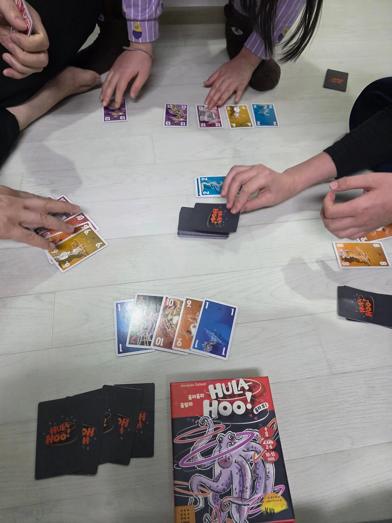 오랜만에 본 아이들에게 미안했는지 순순히 거실에 앉는 남편. 도블로 몸 풀기를 하고 서펜티나로 흥을 돋았다. 이제 대망의 훌라후! 요새 아이들이 가장 열광하는 게임이다.