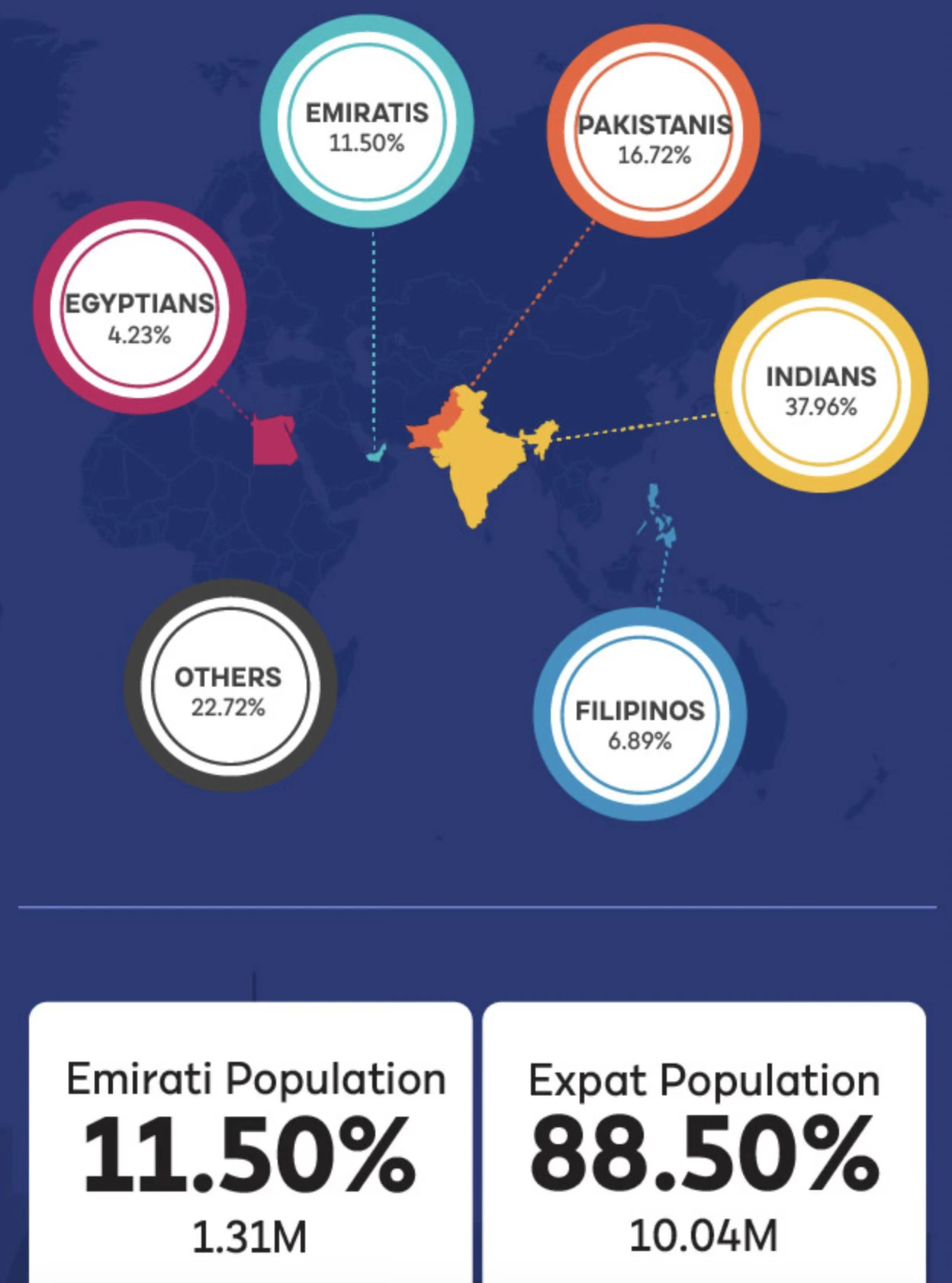 아랍에미리트에서는 아무리 오래 살아도, 심지어 이곳에서 태어나도 외국인에게는 시민권이 주어지지 않는다. 2025년 기준, 로컬 에미라티는 전체 인구의 11.5%뿐이고, 나머지 88.5%는 모두 외국인이다. (https://www.globalmediainsight.com/blog/uae-population-statistics/#population_of_uae_in_2018 검색일: 2025.10.29)