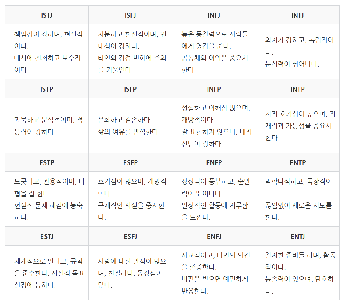 왼쪽 맨 위 ISTJ부터 성향들을 하나하나 읽어보니 나 역시도 이래저래 다 맞는 것 같기도 하고. 만약 테스트를 하지 않고 이 차트를 보고 이 중에서 내 성향과 맞는 것을 골라보라고 했다면 다른 결과가 나왔을 것 같은 수상한 예감이 든다.