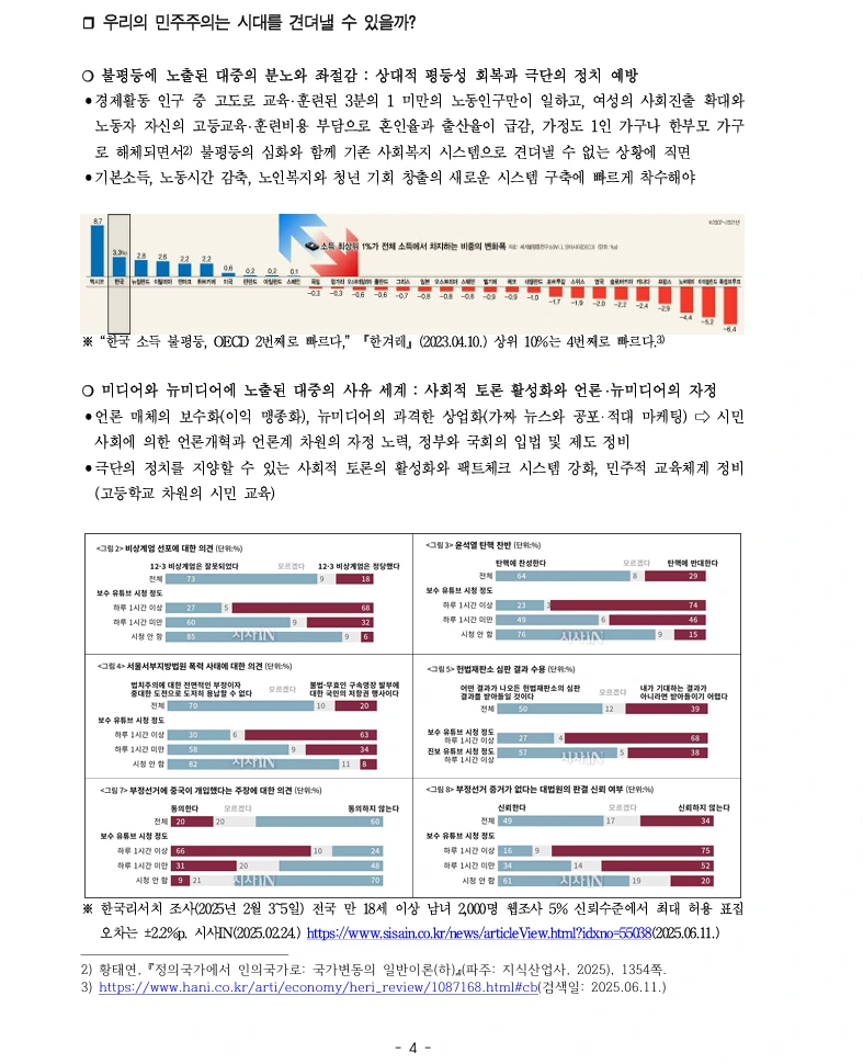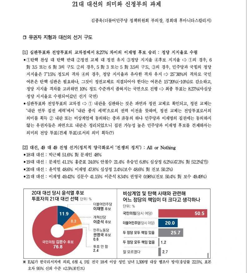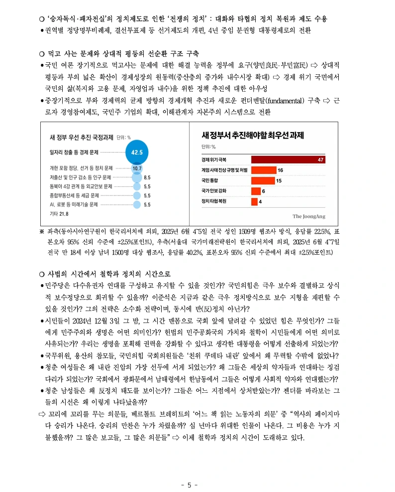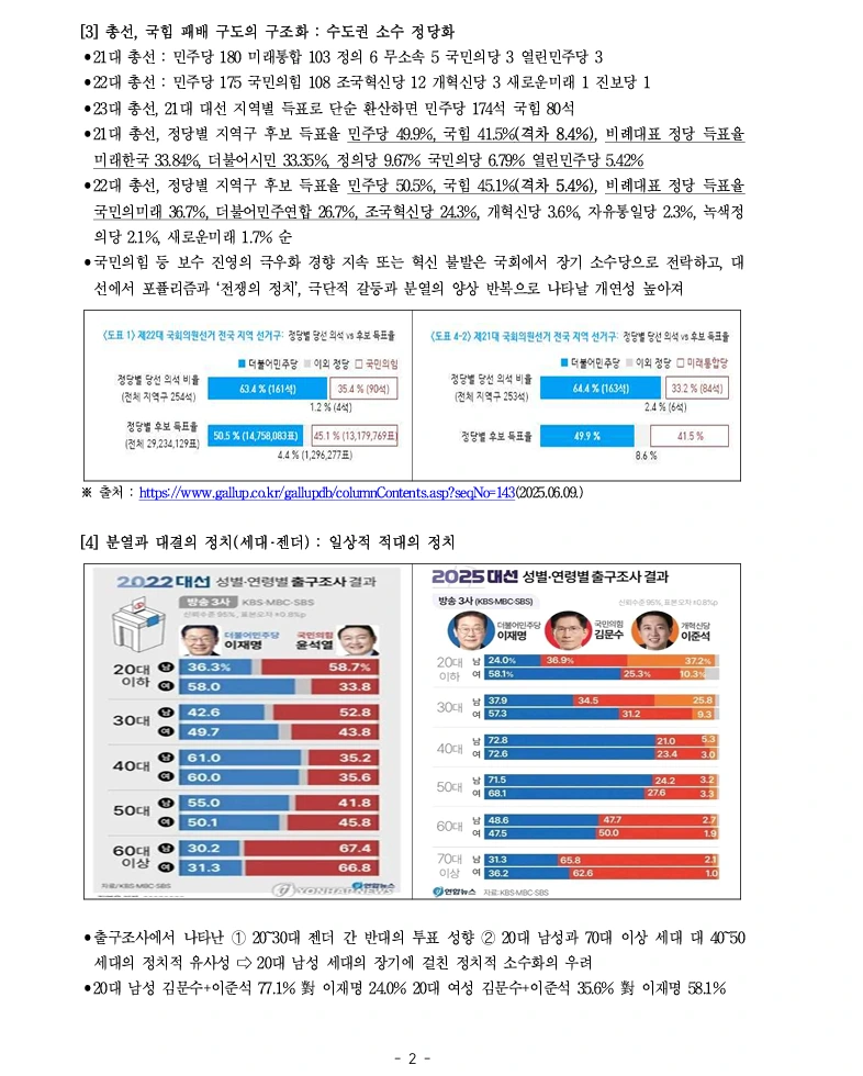 한국정치커뮤니케이션학회가 개최한 2025년 봄철 정기학술대회(6월 21일)에 참석해서 “21대 대선의 의미와 신정부의 과제”라는 글을 발표했습니다. “내란 사건과 정치 양극화 구조의 충돌”로서 21대 대선의 의미를 해석하고, 다섯 가지의 주목할 지점을 아래와 같이 제시했습니다. 심판투표와 견제투표의 충돌 정치적 양극화로서 ‘전쟁의 정치’ 국힘의 수도권 소수 정당화 일상적 적대의 정치(세대와 젠더의 충돌) 일상적 극단의 정치(극우정치세력의 구조화) 동시에 앞으로의 과제로 네 가지 정도를 제시했습니다. 불평등에 노출된 대중의 분노와 좌절감 상대적 평등성 회복과 극단의 정치 예방 미디어와 뉴미디어에 노출된 대중의 사유 세계 사회적 토론 활성화와 언론 뉴미디어의 자정 ‘승자독식‧패자전실’의 정치제도로 인한 ‘전쟁의 정치’ 대화와 타협의 정치 복원과 제도 수용 먹고 사는 문제와 상대적 평등의 선순환 구조 구축 등입니다. 최종적인 저의 가장 큰 문제 의식은 이제 “사법의 시간에서 철학과 정치의 시간으로” 진입해야 한다는 것입니다.
