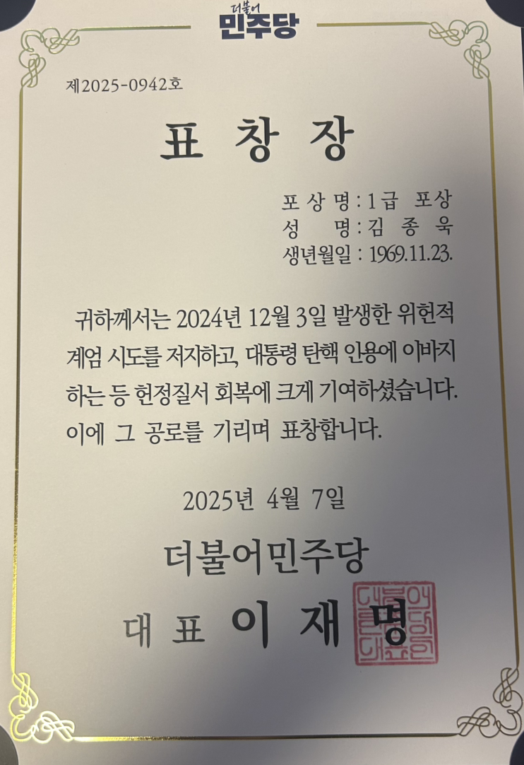 이재명 대통령이 민주당 당 대표로 계실 때, 포상한다고 했는데, 6월 하순에 표창장을 받았습니다. 위헌적 비상계엄을 자행한 윤석열 정권에 맞서 싸웠다는 상이어서 부끄럽기도 했고 뿌듯하기도 했습니다. 이런 상을 받을 만큼 제대로 싸웠나, 자문해보면 부끄럽습니다. 그래도 위헌‧위법적 비상계엄 친위쿠데타 내란으로 헌정을 무너뜨리고 국민기본권을 훼손하려 했던 자들에 맞서 싸웠다는 흔적이 공식적으로 남아 있게 되어서 뿌듯합니다.