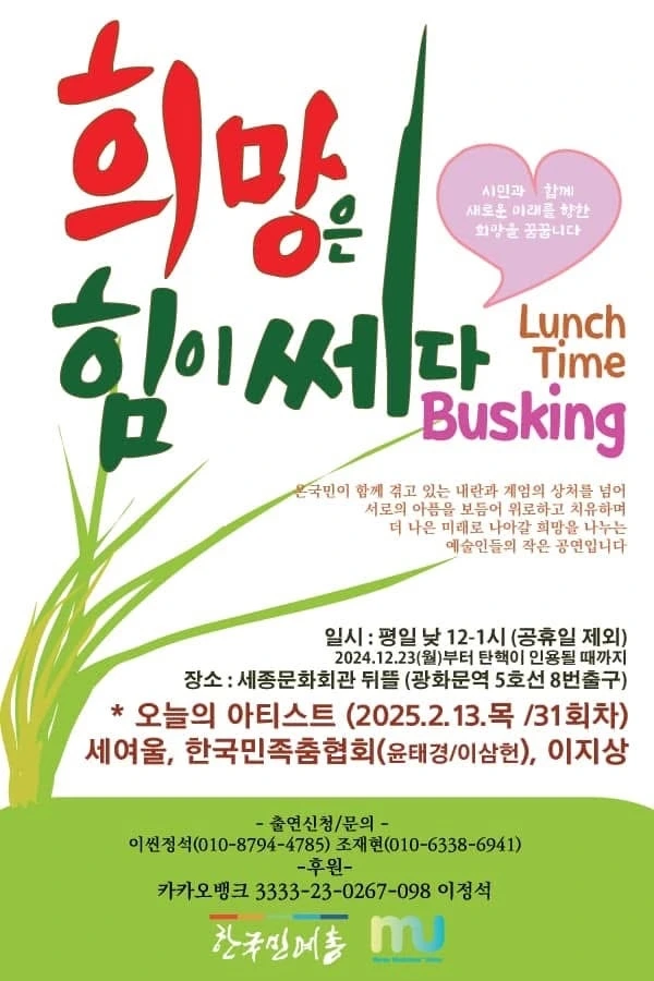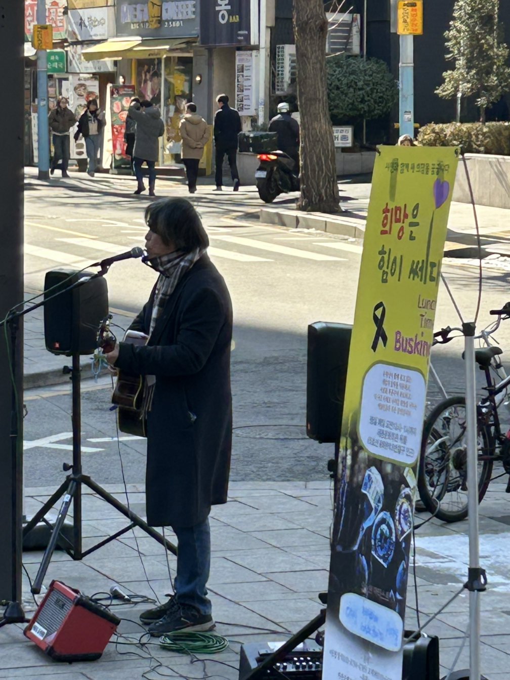 이날도 충무로에서 출발, 명동을 거쳐 광화문까지 걸어가다 보니, 세종문화회관 뒤뜰에서 반가운 얼굴과 목소리를 발견했습니다. 제 후원회장이셨고, 지금은 형님인 이지상 가수가 시민과 함께 새로운 미래를 위한 희망을 꿈꾸는 버스킹을 하고 계시더군요. 세상 곳곳에서 내란 수괴를 무너뜨리고, 내란 세력을 진압하고, 모두가 좀 더 평등하고 평화로운 미래를 이야기하고 노래하고 있었습니다. 인사라고 드리고 싶었으나, 노래에 열중하셔서, 저도 다음 일정으로 이동해야 해서 그저 잠시 노래를 감상했습니다.