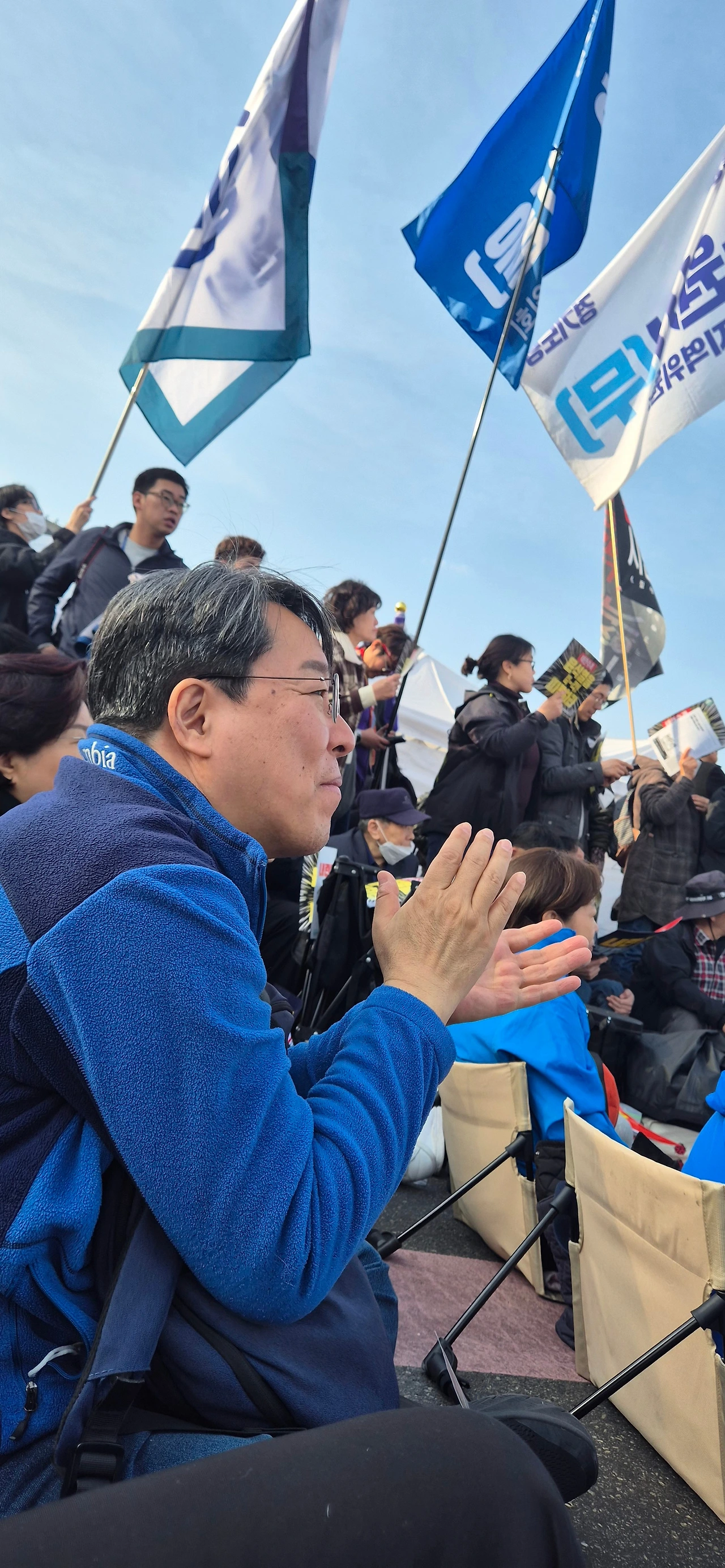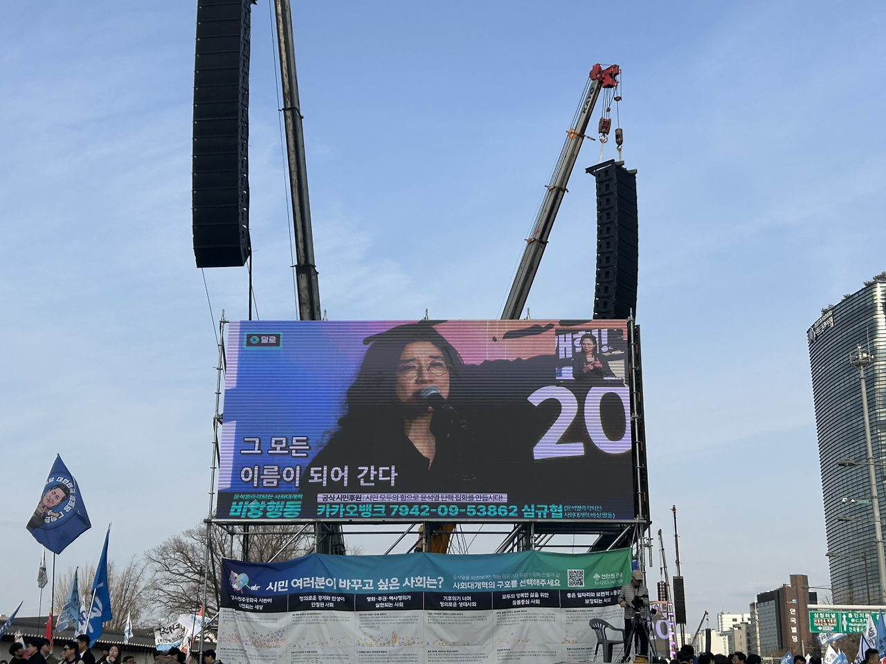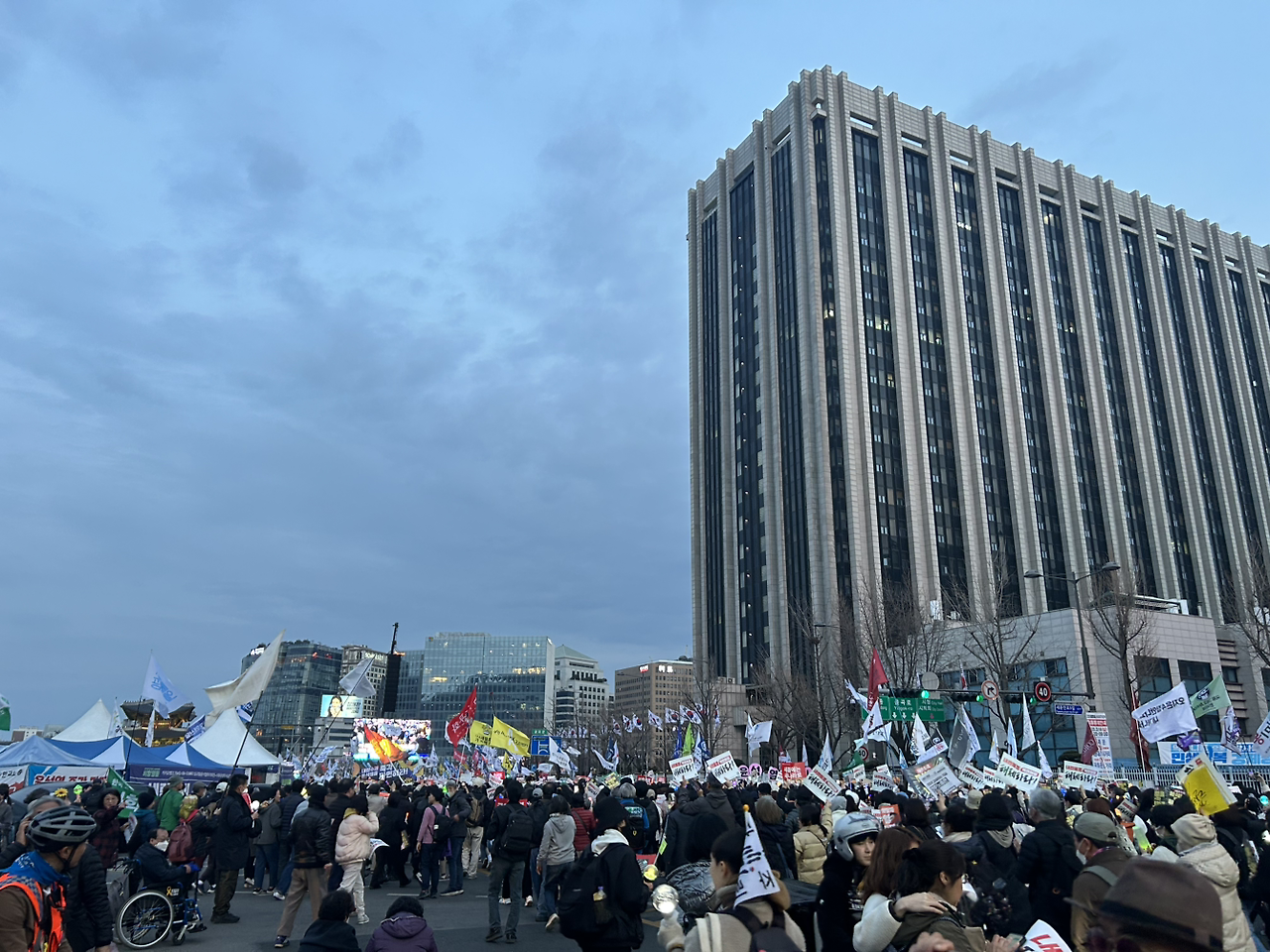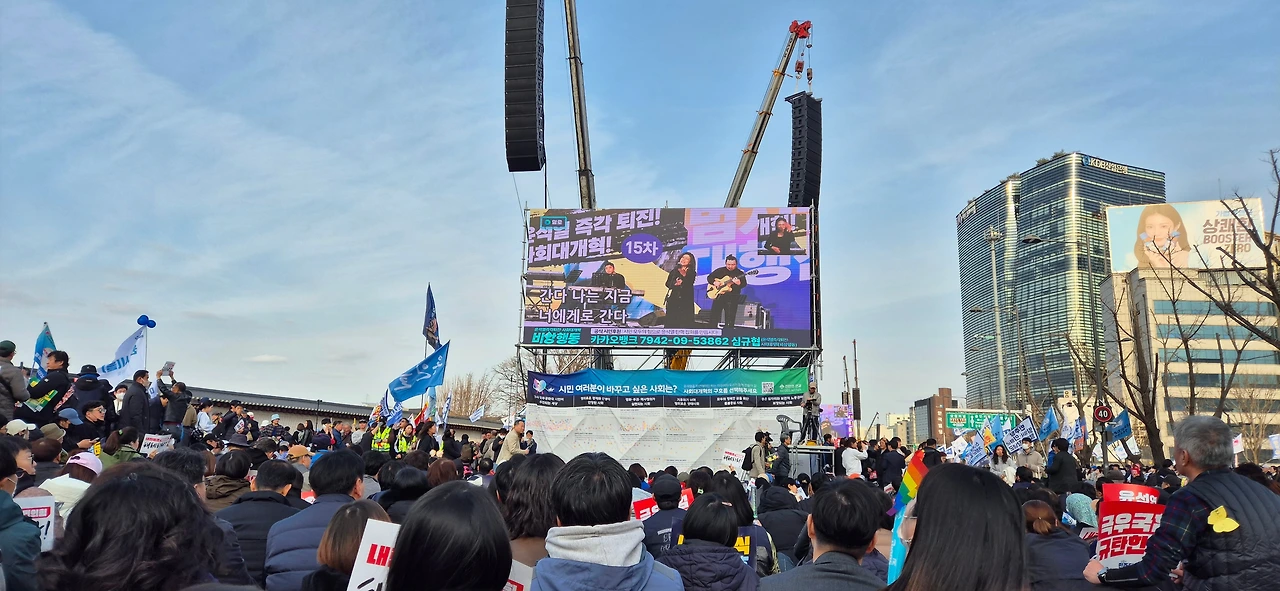 사람들이 모입니다. 그들은 하나의 마음으로 외칩니다. 간절함의 진심은 태산(太山)이었습니다. 그렇게 광화문 동십자각 공간은 ‘진심의 공동체’였고, 새로운 세상에 대한 ‘갈망의 공동체’였습니다. 어떻게 만들어온 민주주의인데, 어떻게 지켜온 국민주권인데, 내란의 우두머리와 내란 세력에게 빼앗길 수 없다는 간절함이었습니다. 그 비장함의 테두리는 여유와 해학으로 어우러졌고, 내란 세력에 대한 분노의 격렬함은 새 세상에 대한 희망의 간절함으로 이어졌습니다. 그렇게 모였고, 그렇게 외쳤고, 그렇게 걸었습니다. 국민 기본권을 짓밟은 자 단죄될 것이며, 국헌을 문란케 한 자 형벌이 기다릴 것입니다. 내란 우두머리와 공범자들의 내란 지속 행위는 국민의 명령으로 처벌될 것입니다. 파면은 결정된 미래이며, 우리는 사회대개혁의 길을 걸을 것입니다. 동십자각 화면에 비친 그 순진무구한 아이들을 미래를 위해서 우리는 걸음을 멈출 수 없습니다. 이제 고지 앞입니다. 고지의 팻말에는 승리하고 적혀 있고, 파면이라고 적혀 있을 것입니다.