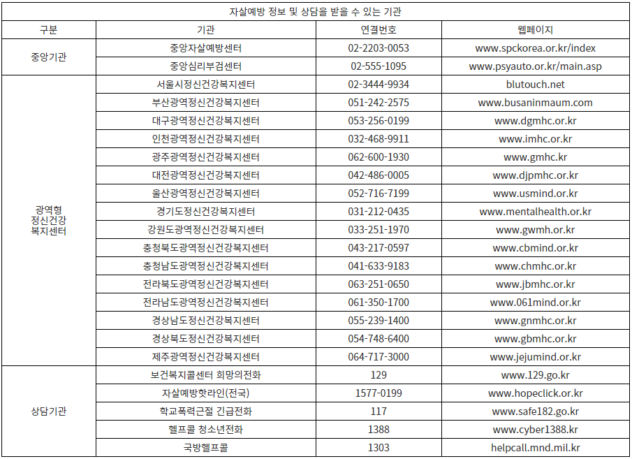 글을 마무리하면서, 한국기자협회의 권고기준 3.0에 포함되어 있는 '자살예방 정보 및 상담을 받을 수 있는 기관' 정보를 공유하고자 한다.