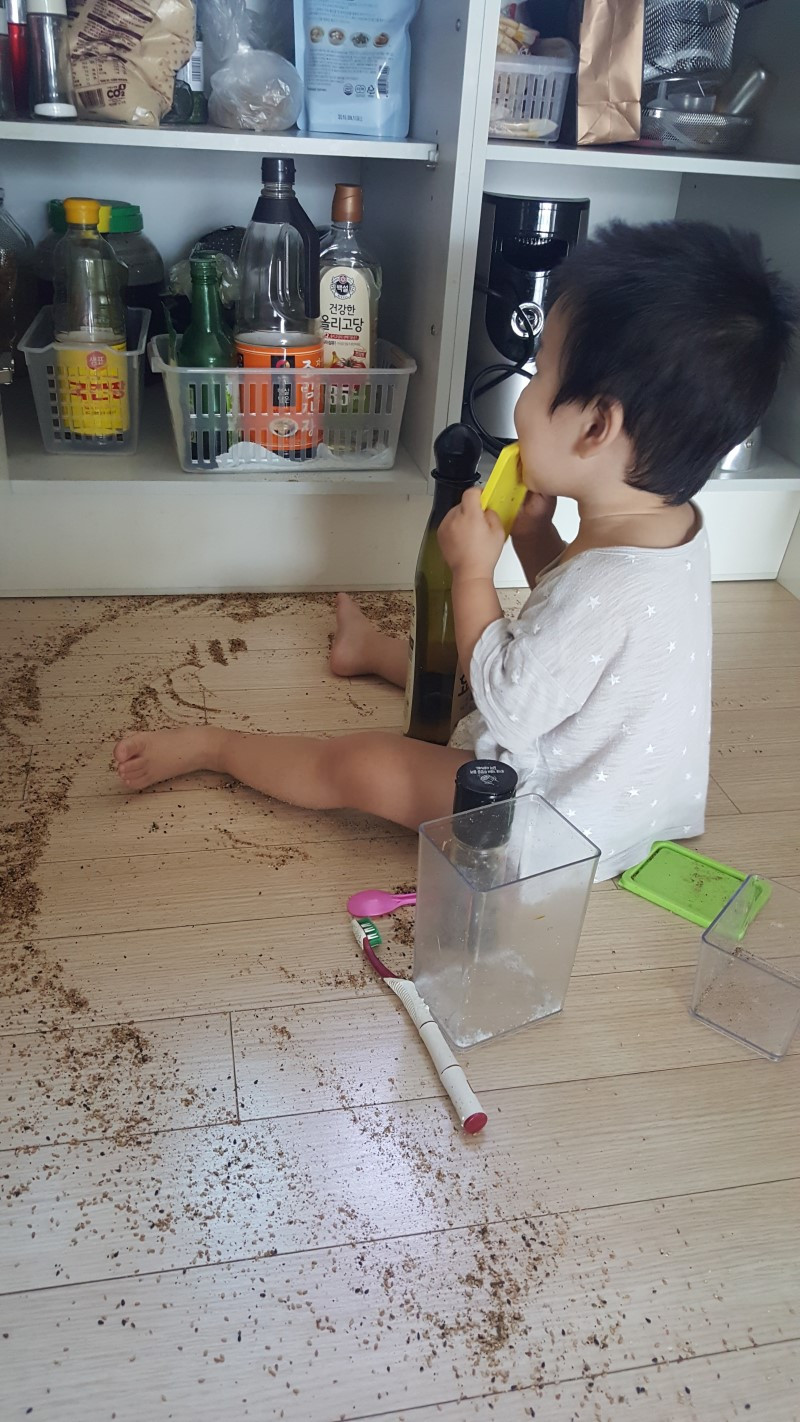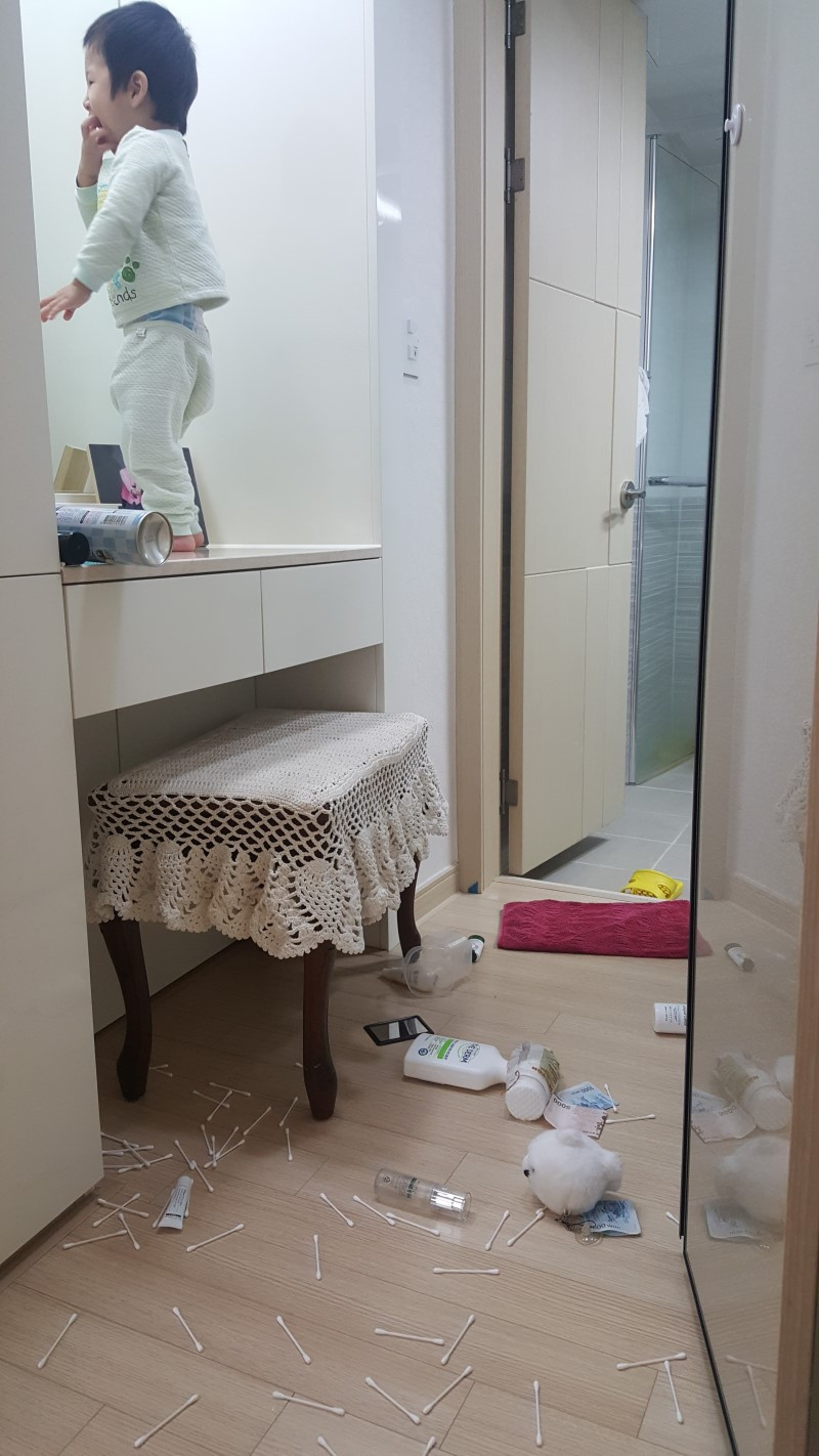 나는 괴물처럼 소리를 지르고 물 없는 쪽으로 아기를 끌었다. 무섭게 째려봤다. 아기는 조용히 나를 쳐다봤다. 내 눈치를 보더니 젖은 옷 그대로 터벅터벅 거실로 걸어갔다. 앉아서 조용히 자동차를 가지고 논다.