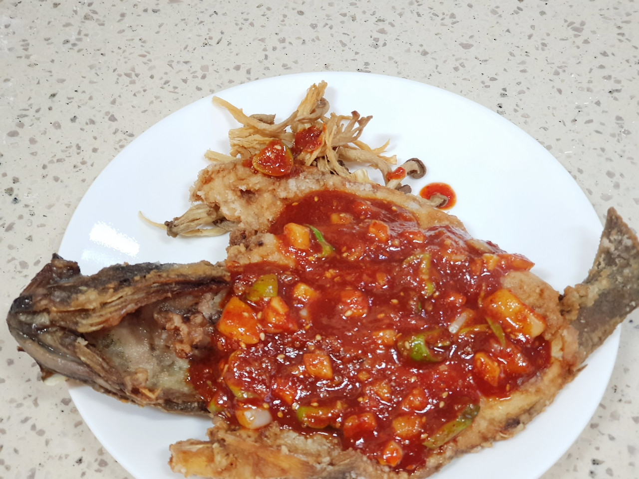 하지만 손질된 우럭을 산다면 집에서 만들어 볼 만하다. 우럭에 전분 묻혀 튀기면 끝, 양념장은 고추장, 케첩, 마늘, 올리고당, 다진 야채만 있으면 끝. 생각보다 간단했다.