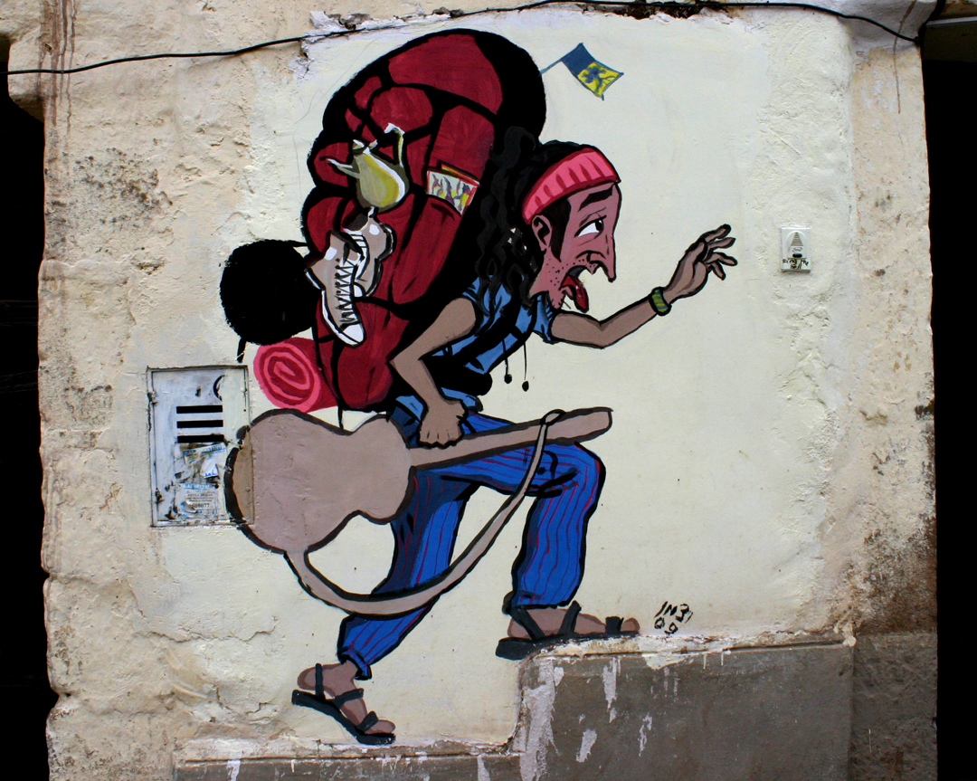 ※ 호스텔로 올라가는 마지막 난관. 마지막 언덕의 저 위에 내가 묵을 숙소가 있었다. 최고난이도의 언덕을 마주했을 때 느꼈던 절망이란! 그렇지만 갈 수 밖에 없지 않은가. 벽에 그려진 배낭여행자의 우스꽝스런 모습이 딱 나의 모습이었다.