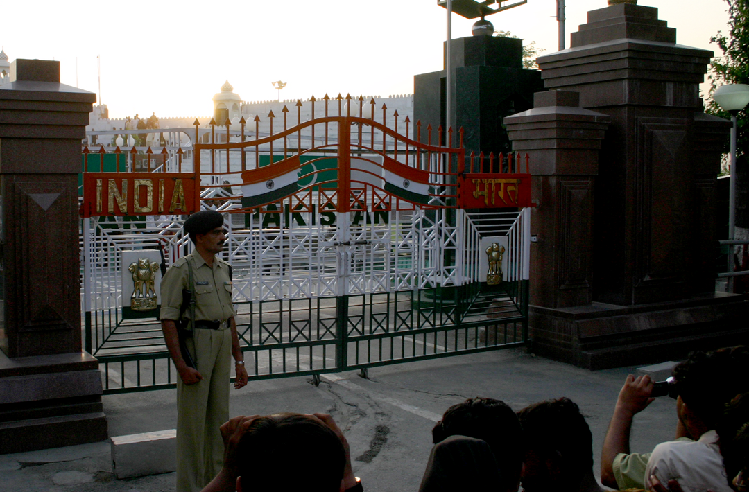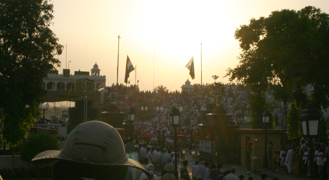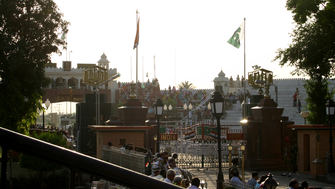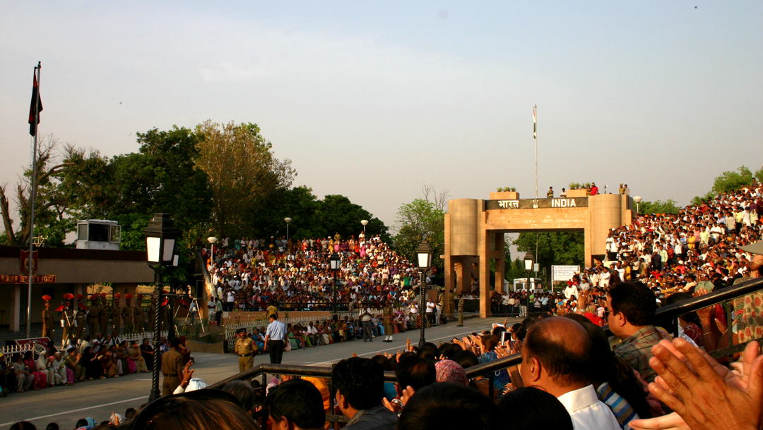 ※ 국기 하강실이 진행되는 인도-파키스탄의 국경 와가. 왼쪽이 파키스탄 쪽이고 오른쪽이 인도쪽이다. 인도쪽 관중석에는 많은 인파가 모여있다.
