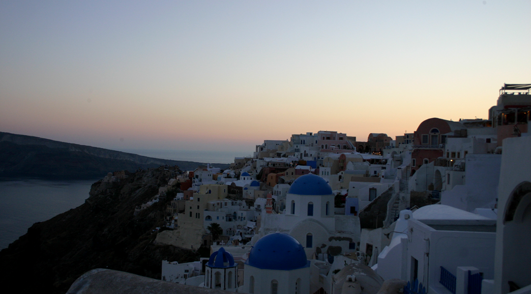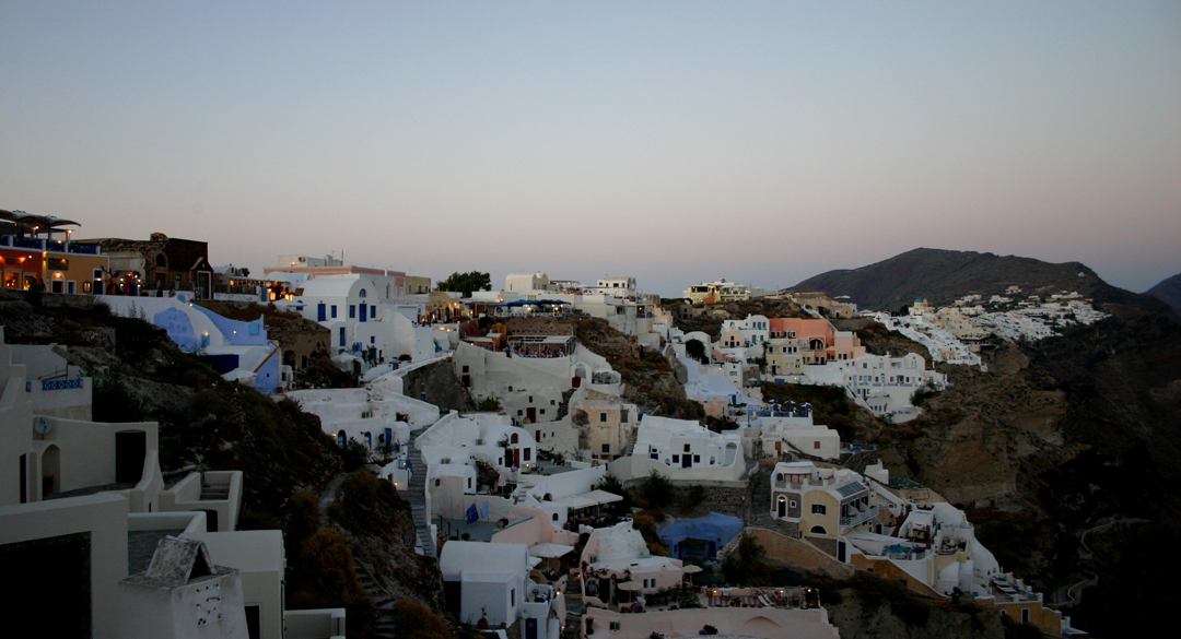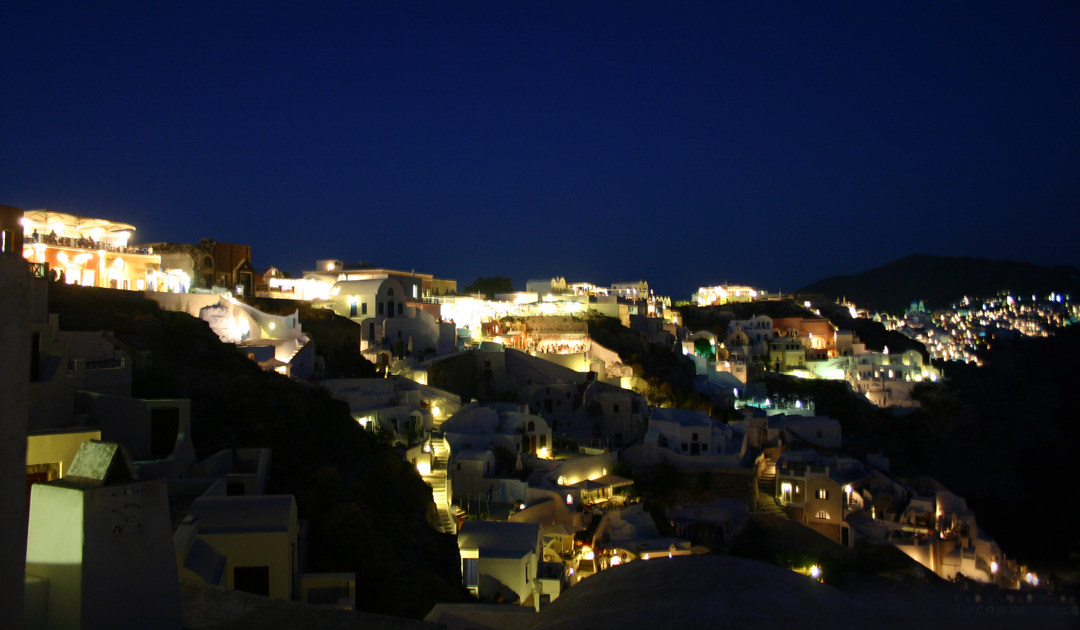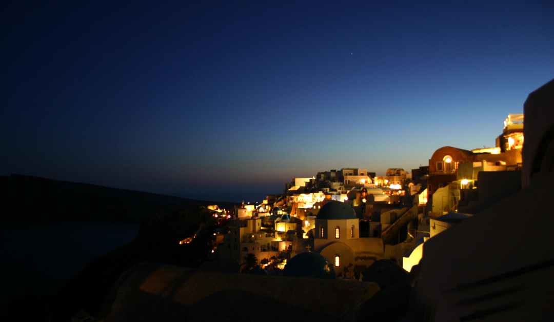 ※ 해질녘의 이아 마을(왼쪽)과 어둠이 깔린 뒤의 산토리니.