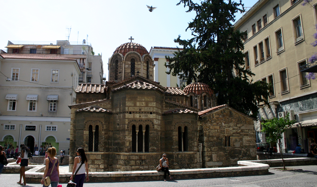 ※ 모나스티라키 센터 근처의 광장(왼쪽)에서 나는 합주를 했다. 처음 젬배 연주를 시작한 곳은 파나기아 카프니카레아 교회 앞, 사진 속 여자가 앉아 있는 장소(오른쪽).