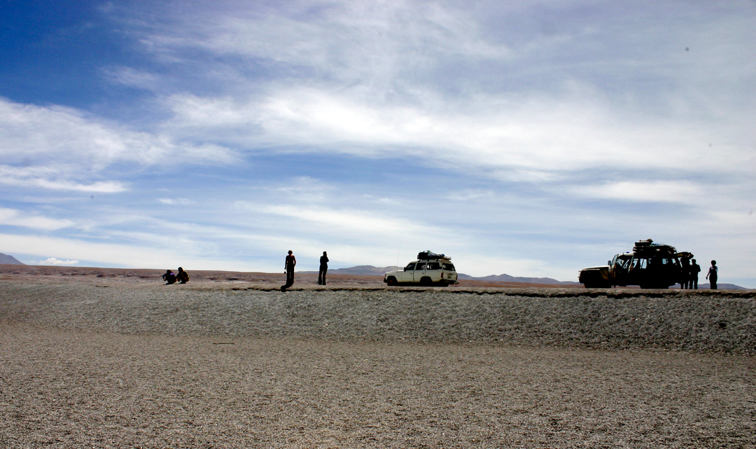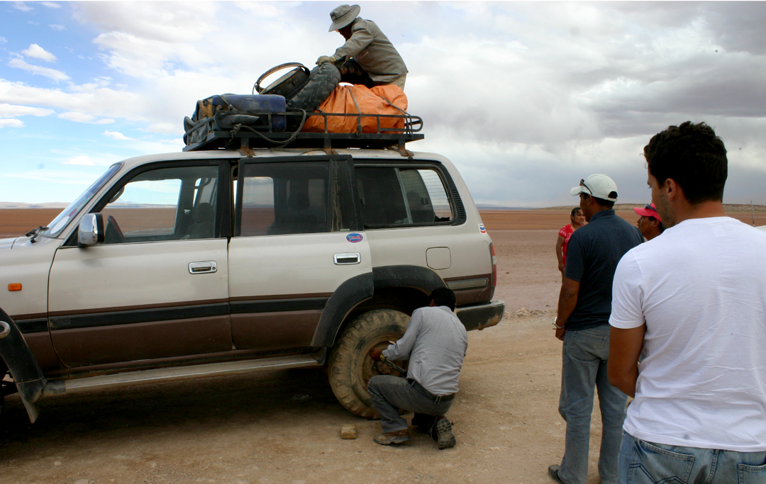 우유니에서 돌아오는 길. 비포장 도로를 달리는 일은 여행자에게도 지프에게도 힘든 일이었다. 운전기사는 사막 투어를 다녀오면서 펑크가 안 난 것은 이번이 처음이라고 했다. 구멍난 타이어 때문에 지프가 길가에 주저 앉은 모습은 흔히 볼 수 있는 일이었다. 우유니로 돌아온 우리들은 각자의 숙소로 흩어졌다. 다시 모이는 시간은 저녁 7시였다. 투어는 끝났고 뒤풀이를 시작할 시간이다.