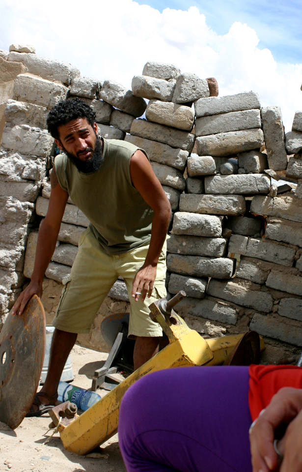 ※ 점심 식사를 마친 뒤 그늘에 앉아 쉬는 중이다(왼쪽). 에드손은 솥뚜껑을 두드려가며 음악을 만들어냈다. 능력자.