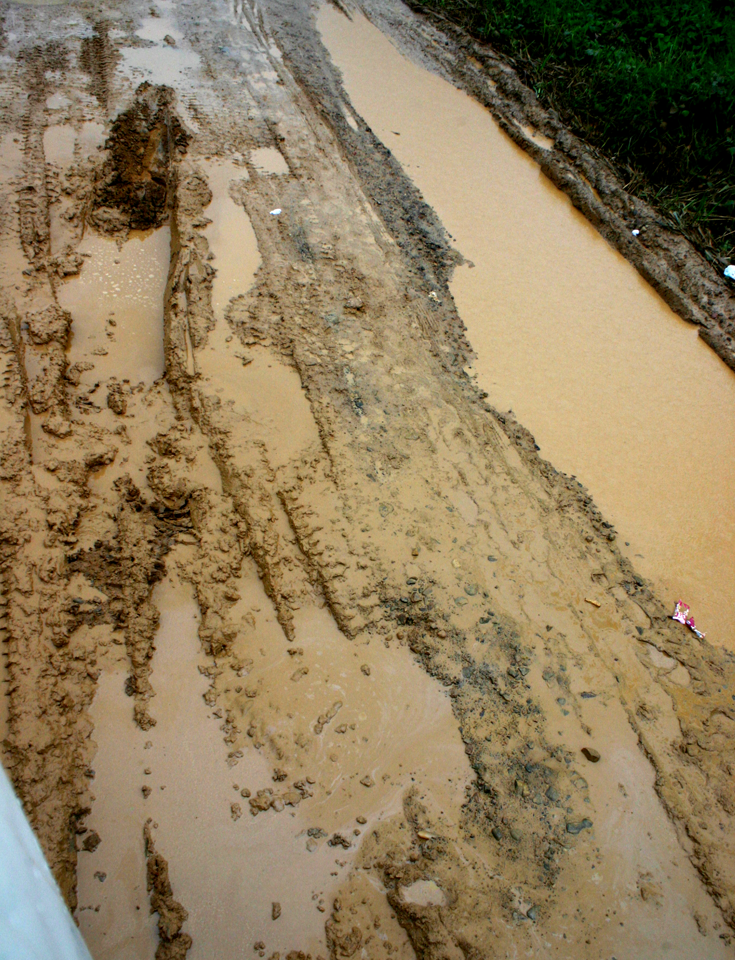 ※ 아마존의 비포장 도로는 진창길이었다. 바퀴가 물웅덩이에 빠지자 버스 기사 아저씨는 바가지를 들고 물을 퍼냈지만 버스는 움직이지 않았다(왼쪽). 루레나바크에는 여행자들이 많았지만 이곳에도 여전히 비가 내렸다(왼쪽).