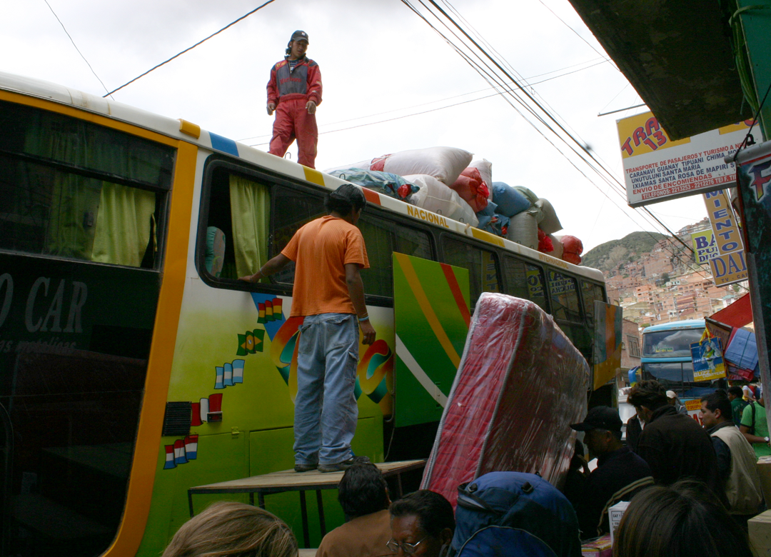 먼 길을 떠나는 버스 위에는 짐이 한가득 실렸다. 버스 출발 예정 시간인 12시가 한참 지났지만 사람들은 버스 위에 짐을 싣기 위해 분주하게 움직였다. 버스 위에 가득 올려진 짐과 휘청거리는 버스. 금방이라도 쓰러질 것만 같았다. 짐 싣기를 마친 버스가 이제막 출발하려 할 때 빗방울이 창가에 맺혔다. 라파스의 마지막 모습은 비에 젖어 있었다.