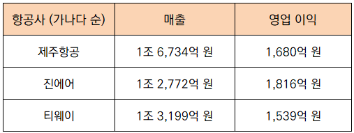 2023년 기준 제주항공은 1조 6,734억 원, 티웨이가 1조 3,199억 원으로 2위, 진에어가 1조 2,772억 원으로 3위입니다.