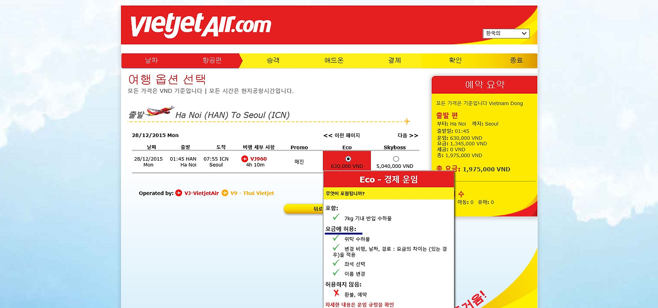 베트남 저가 항공사인 비엣젯 항공 사이트에서 굉장히 저렴한 표를 구할 수 있었다.
