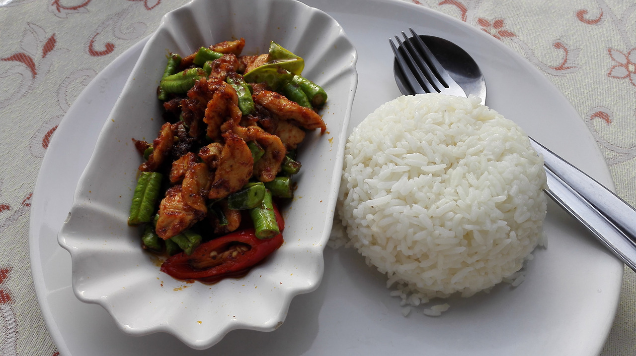 # 끄라비 터미널에서 먹은 오징어와 아스파라거스 볶음. 양념이 매콤하다.