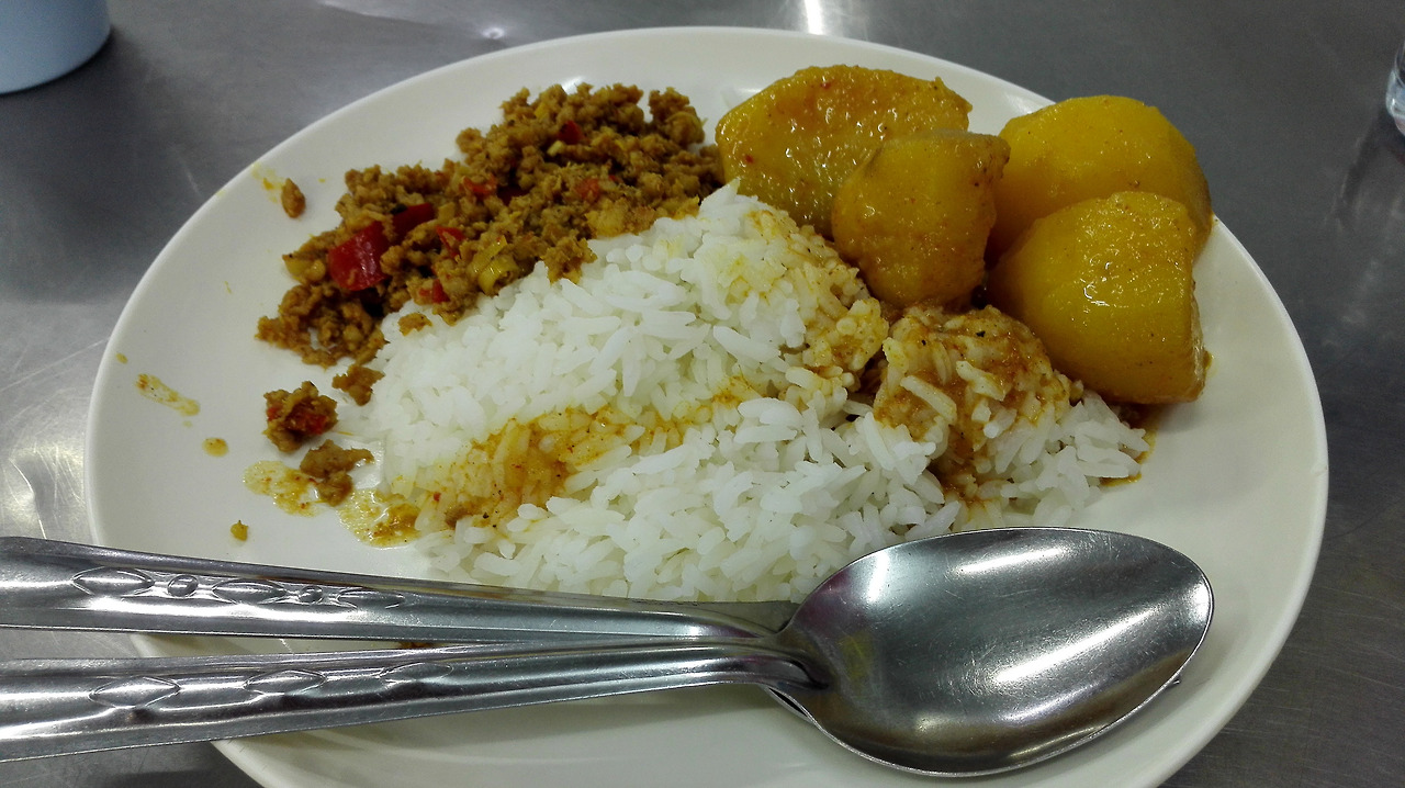 # 밥에다 반찬을 덜어 먹는 부페식. 감자와 돼지 고기 갈은 걸 먹었는데 40바트.